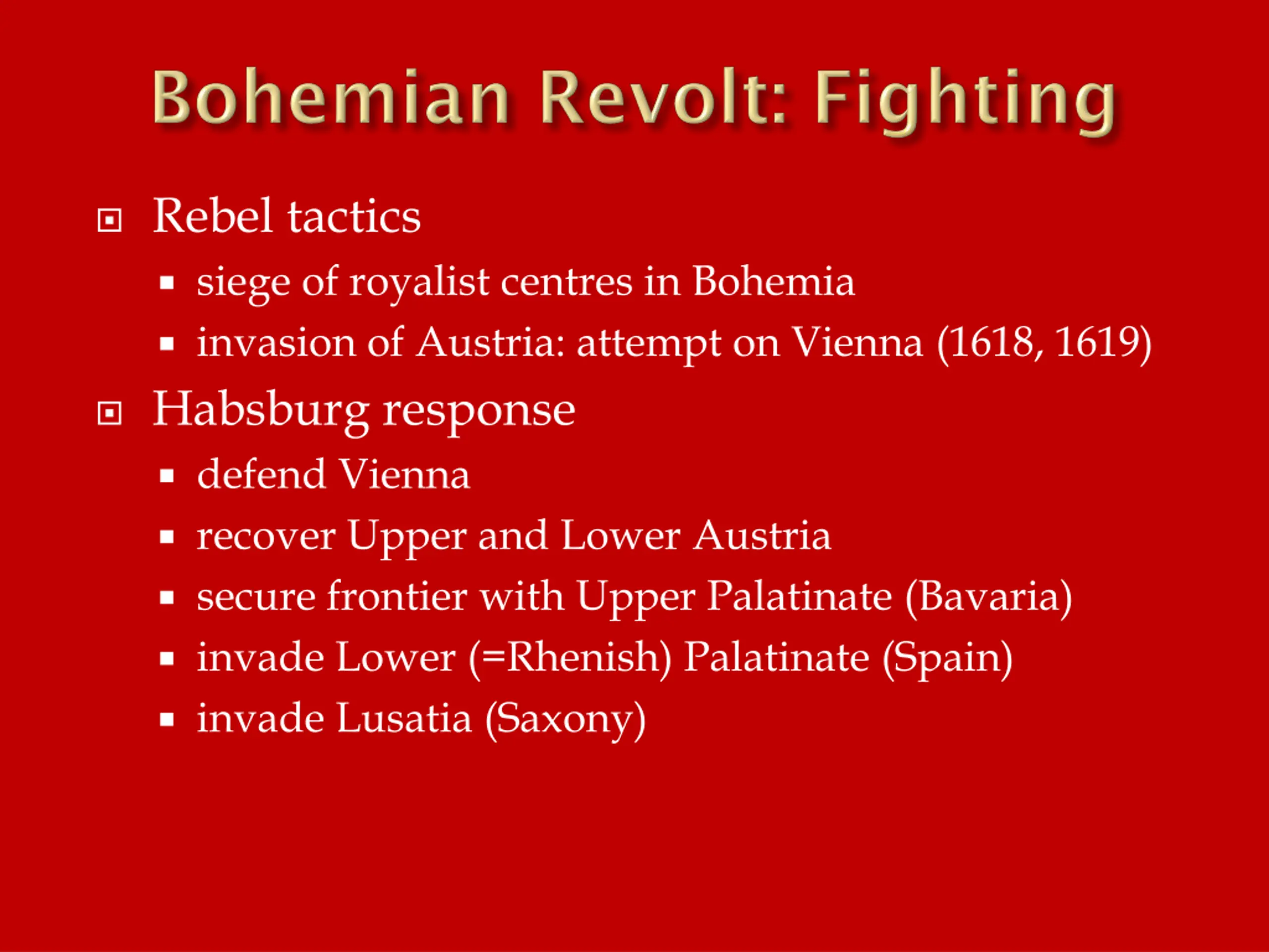 Rebel tactics siege of royalist centres in Bohemia invasion of Austria: attempt on Vienna (1618, 1619) Habsburg response defend Vienna recover Upper and Lower Austria secure frontier with Upper Palatinate (Bavaria) invade Lower (=Rhenish) Palatinate (Spain) invade Lusatia (Saxony)