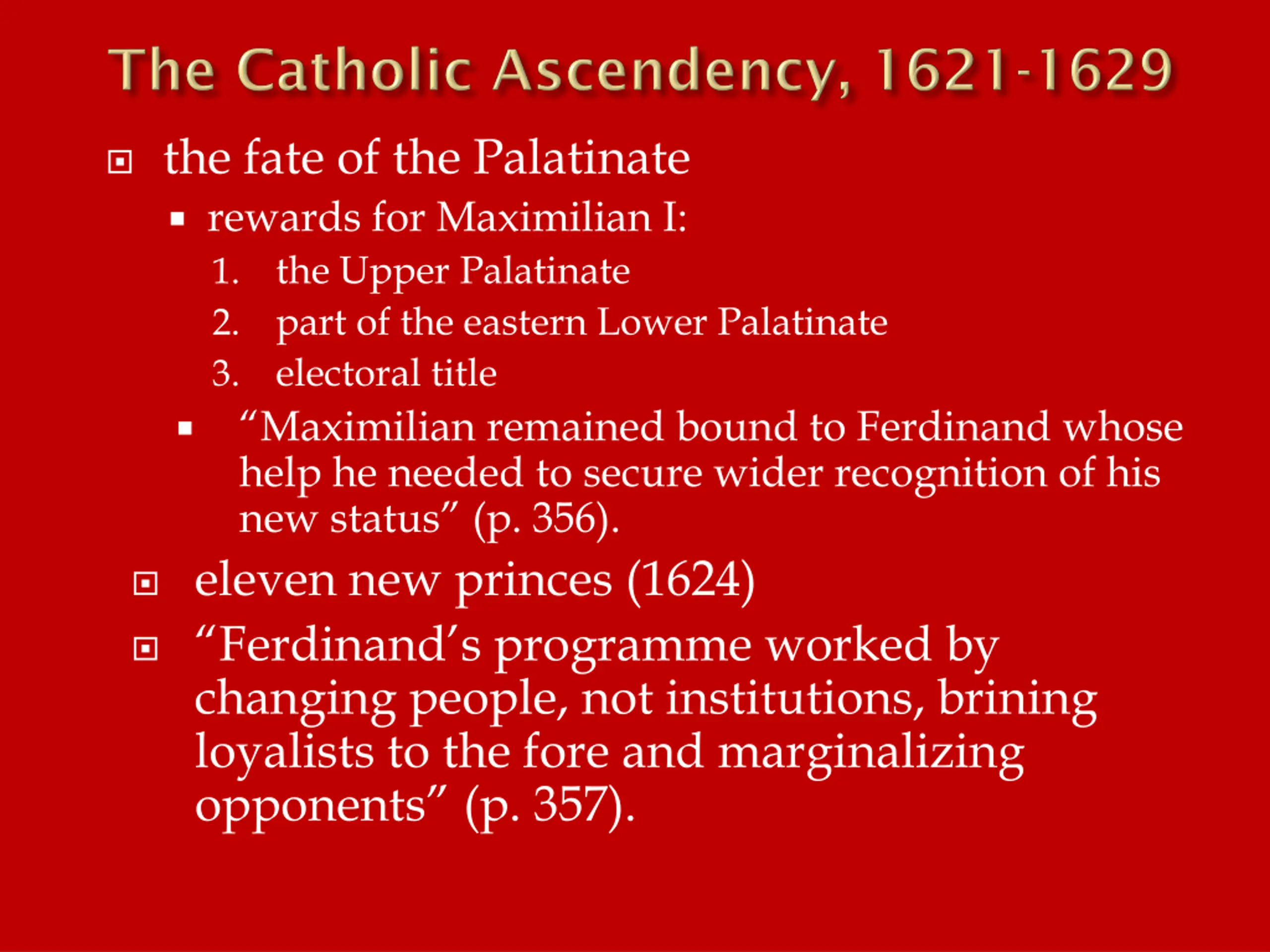 the fate of the Palatinate rewards for Maximilian I: 1. the Upper Palatinate 2. part of the eastern Lower Palatinate 3. electoral title Maximilian remained bound to Ferdinand whose help he needed to secure wider recognition of his new status (p. 356). eleven new princes (1624) Ferdinand s programme worked by changing people, not institutions, brining loyalists to the fore and marginalizing opponents (p. 357).