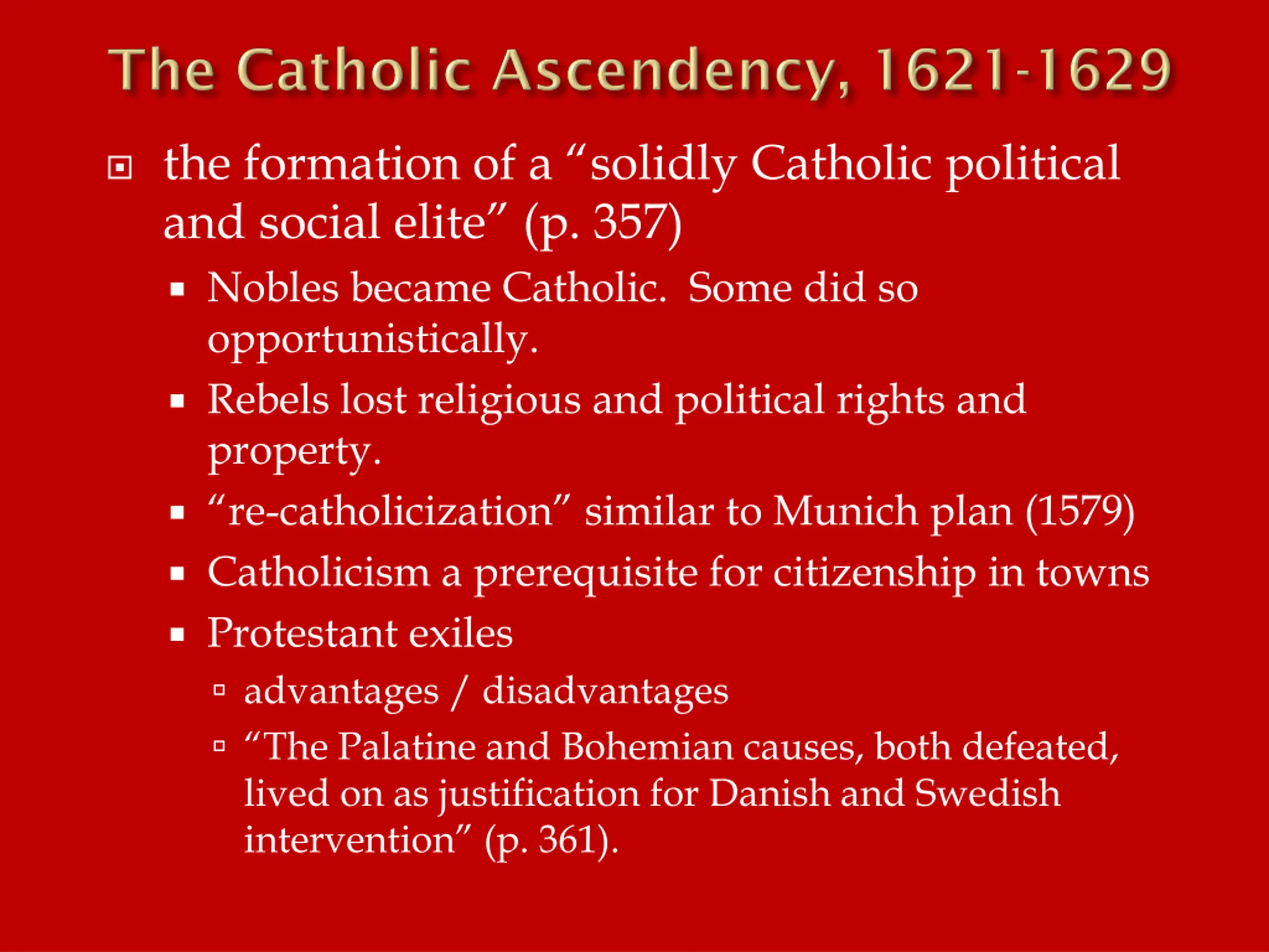 the formation of a solidly Catholic political and social elite (p. 357) Nobles became Catholic. Some did so opportunistically. Rebels lost religious and political rights and property. re-catholicization similar to Munich plan (1579) Catholicism a prerequisite for citizenship in towns Protestant exiles advantages / disadvantages The Palatine and Bohemian causes, both defeated, lived on as justification for Danish and Swedish intervention (p. 361).