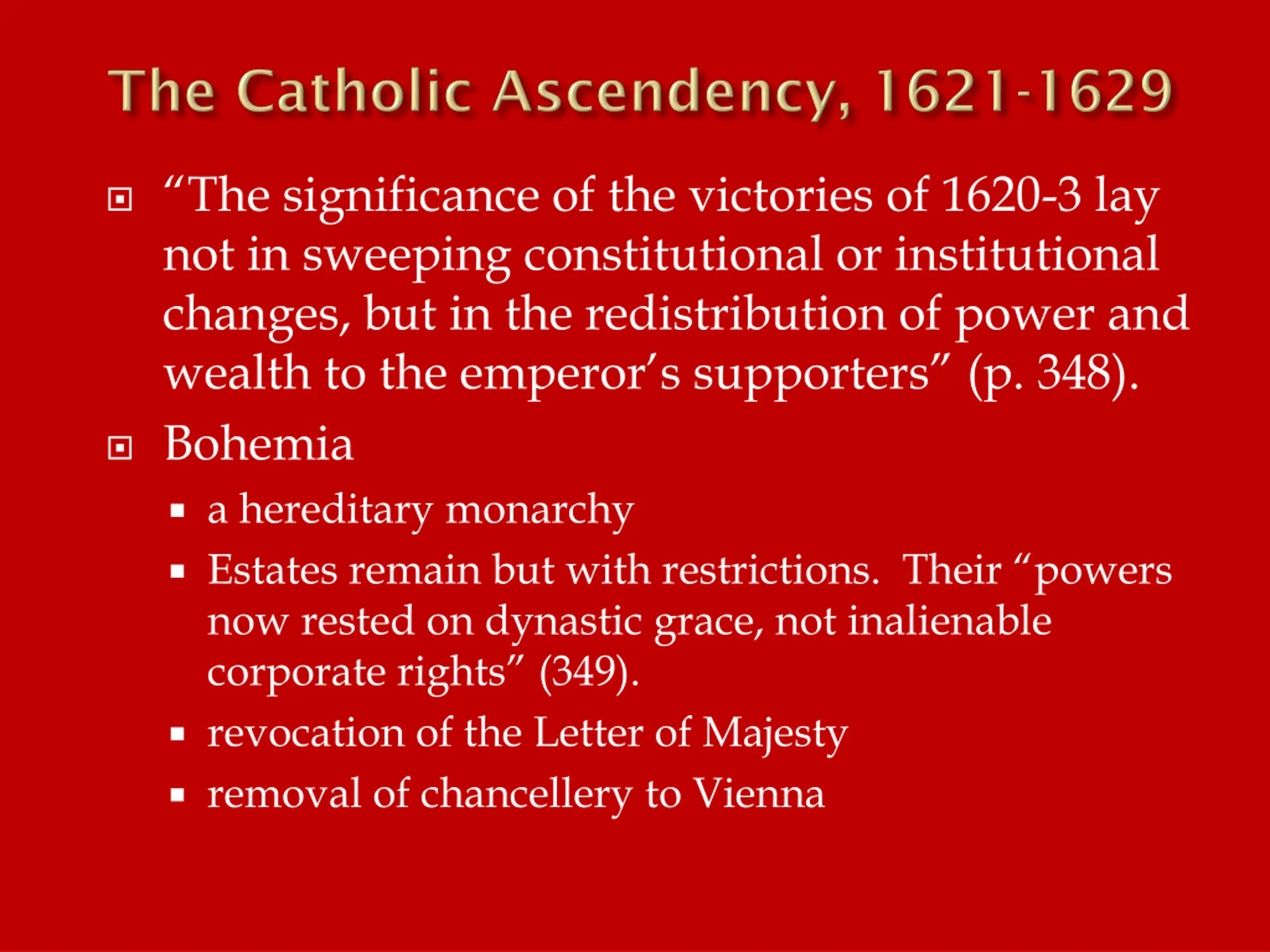 The significance of the victories of 1620-3 lay not in sweeping constitutional or institutional changes, but in the redistribution of power and wealth to the emperor s supporters (p. 348). Bohemia a hereditary monarchy Estates remain but with restrictions. Their powers now rested on dynastic grace, not inalienable corporate rights (349). revocation of the Letter of Majesty removal of chancellery to Vienna