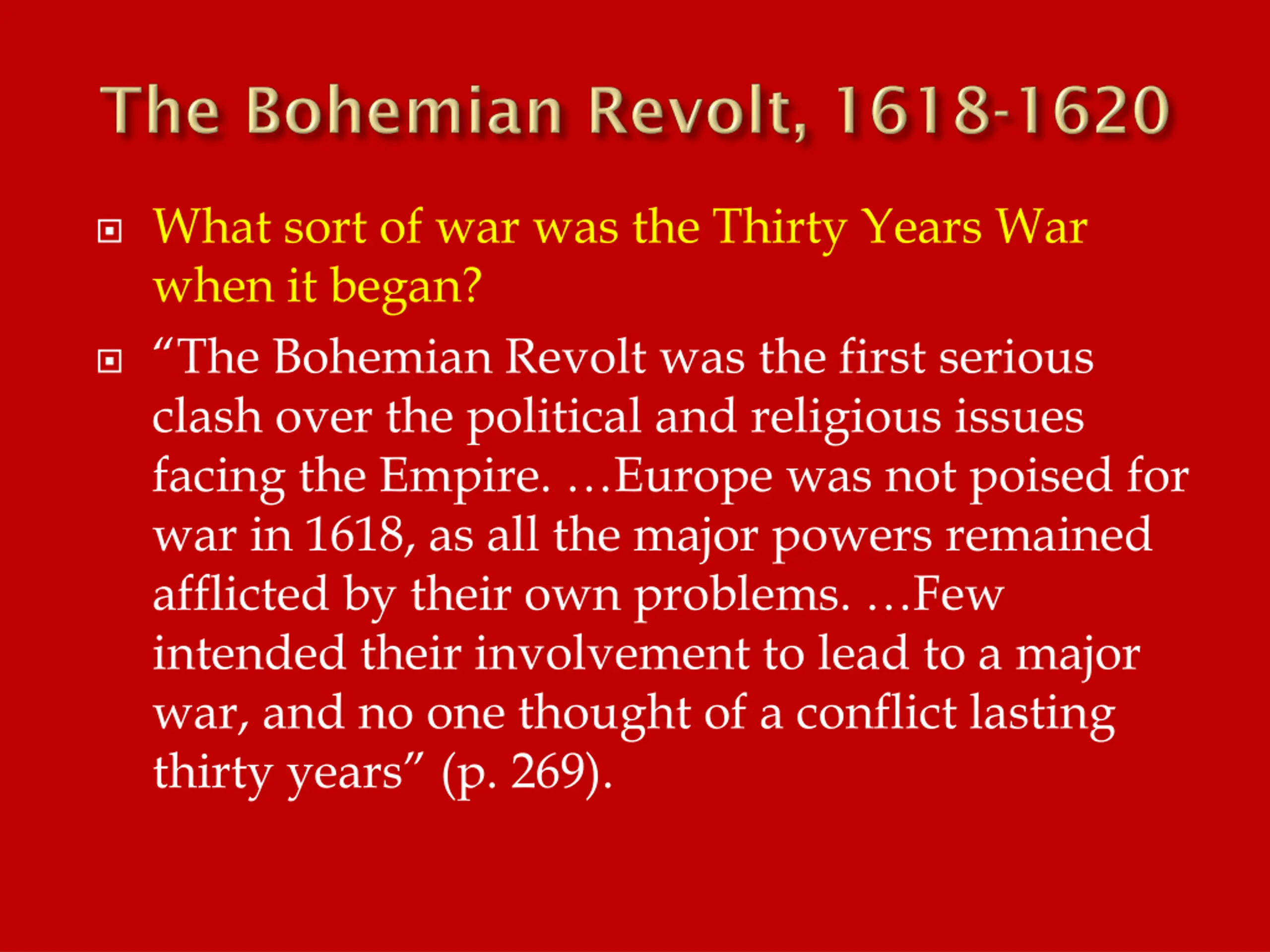What sort of war was the Thirty Years War when it began? The Bohemian Revolt was the first serious clash over the political and religious issues facing the Empire. Europe was not poised for war in 1618, as all the major powers remained afflicted by their own problems. Few intended their involvement to lead to a major war, and no one thought of a conflict lasting thirty years (p. 269).
