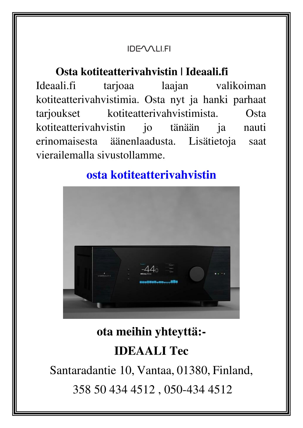 Osta kotiteatterivahvistin | Ideaali.fi Ideaali.fi tarjoaa kotiteatterivahvistimia. Osta nyt ja hanki parhaat tarjoukset kotiteatterivahvistimista. kotiteatterivahvistin jo erinomaisesta nenlaadusta. vierailemalla sivustollamme. laajan valikoiman Osta nauti saat t n n ja Lis tietoja osta kotiteatterivahvistin ota meihin yhteytt :- IDEAALI Tec Santaradantie 10,Vantaa,01380,Finland, 358 50 434 4512 , 050-434 4512