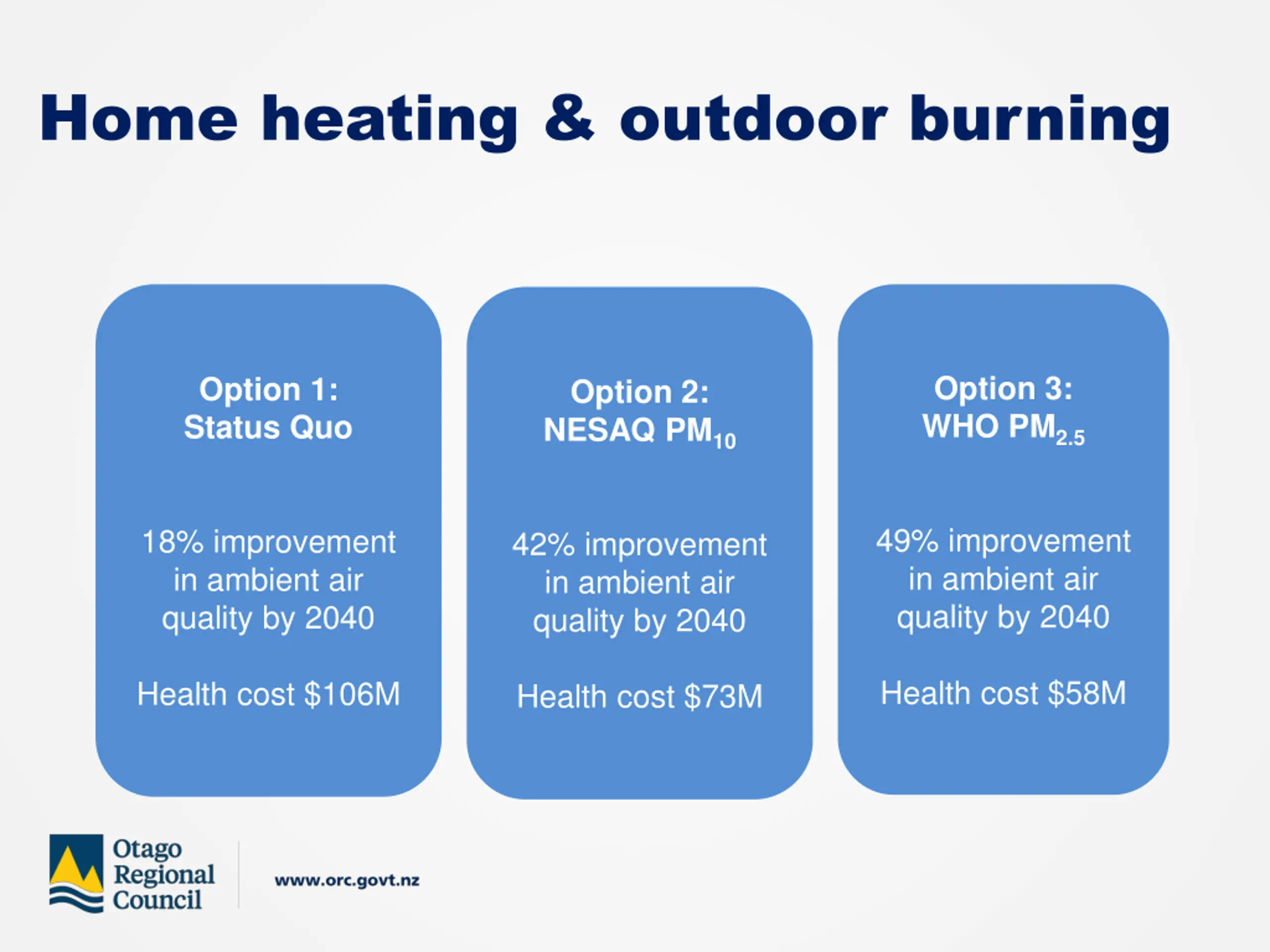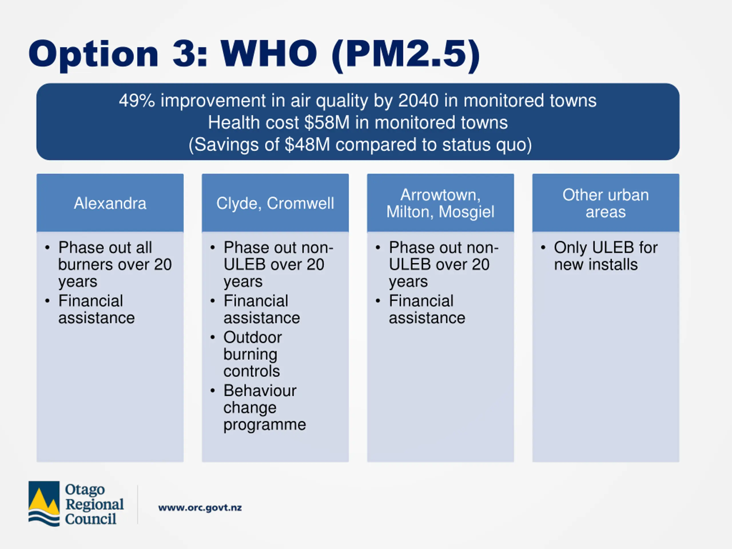 Option 3: WHO (PM2.5) 49% improvement in air quality by 2040 in monitored towns Health cost $58M in monitored towns (Savings of $48M compared to status quo) Arrowtown, Milton, Mosgiel Other urban areas Alexandra Clyde, Cromwell Phase out all burners over 20 years Financial assistance Phase out non- ULEB over 20 years Financial assistance Outdoor burning controls Behaviour change programme Phase out non- ULEB over 20 years Financial assistance Only ULEB for new installs