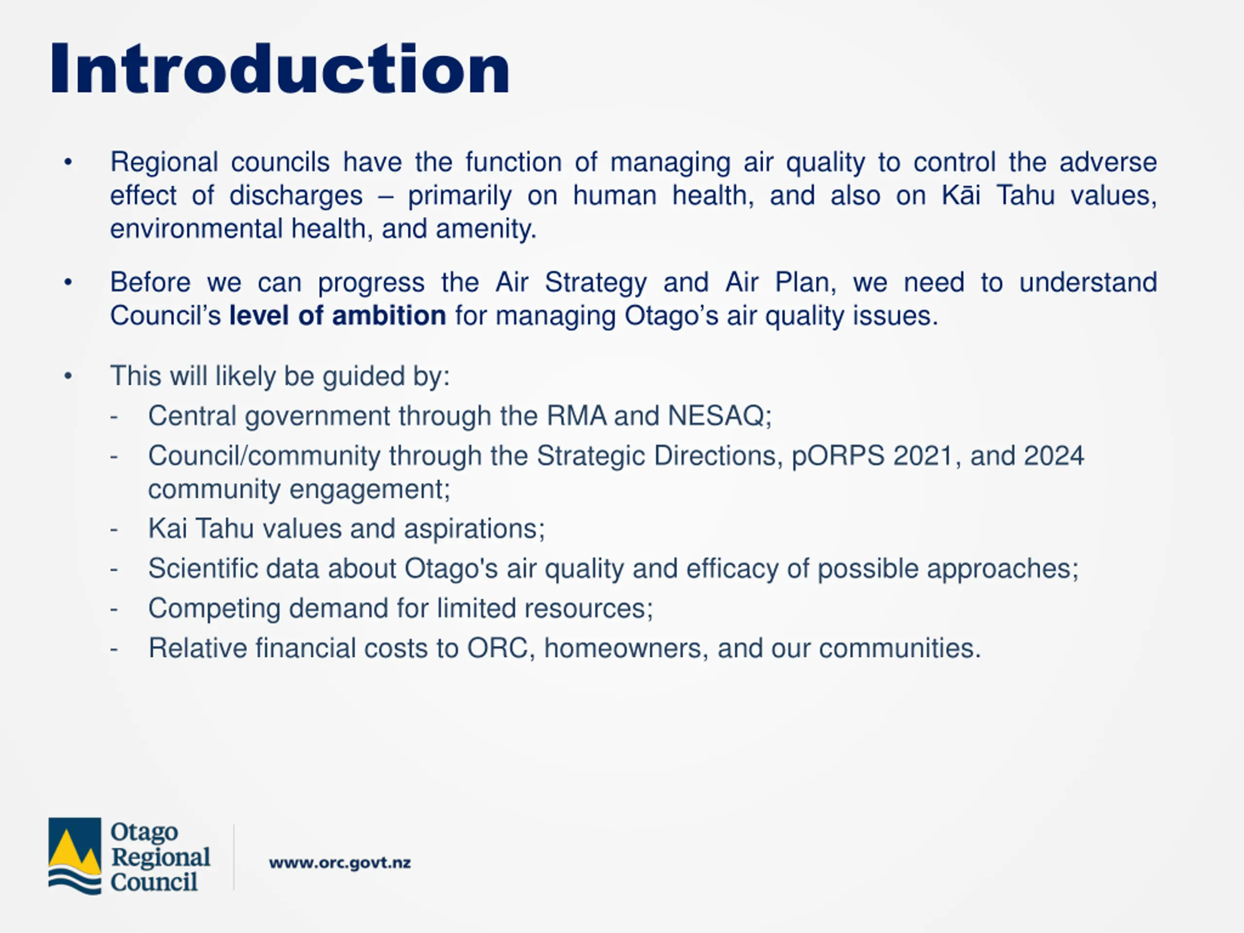 Introduction Regional councils have the function of managing air quality to control the adverse effect of discharges primarily on human health, and also on K i Tahu values, environmental health, and amenity. Before we can progress the Air Strategy and Air Plan, we need to understand Council slevel of ambition for managing Otago s air quality issues. This will likely be guided by: - Central government through the RMA and NESAQ; - Council/community through the Strategic Directions, pORPS 2021, and 2024 community engagement; - Kai Tahu values and aspirations; - Scientific data about Otago's air quality and efficacy of possible approaches; - Competing demand for limited resources; - Relative financial costs to ORC, homeowners, and our communities.