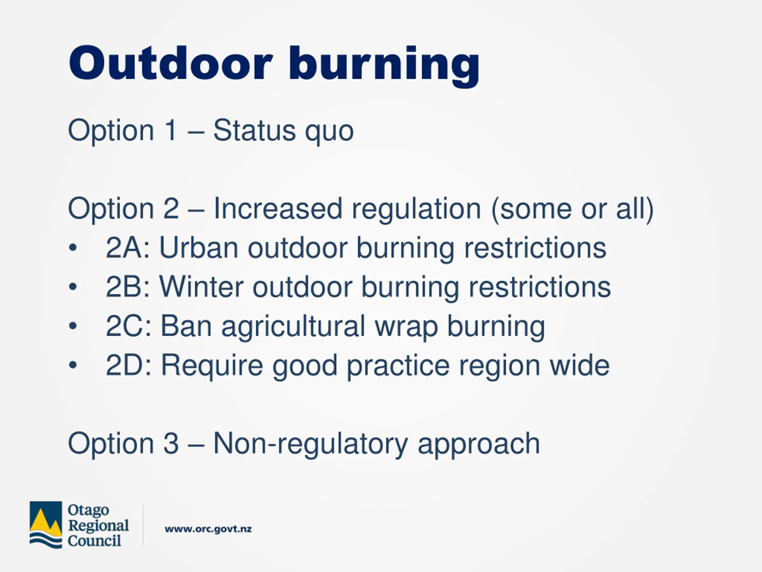 Outdoor burning Option 1 Status quo Option 2 Increased regulation (some or all) 2A: Urban outdoor burning restrictions 2B: Winter outdoor burning restrictions 2C: Ban agricultural wrap burning 2D: Require good practice region wide Option 3 Non-regulatory approach