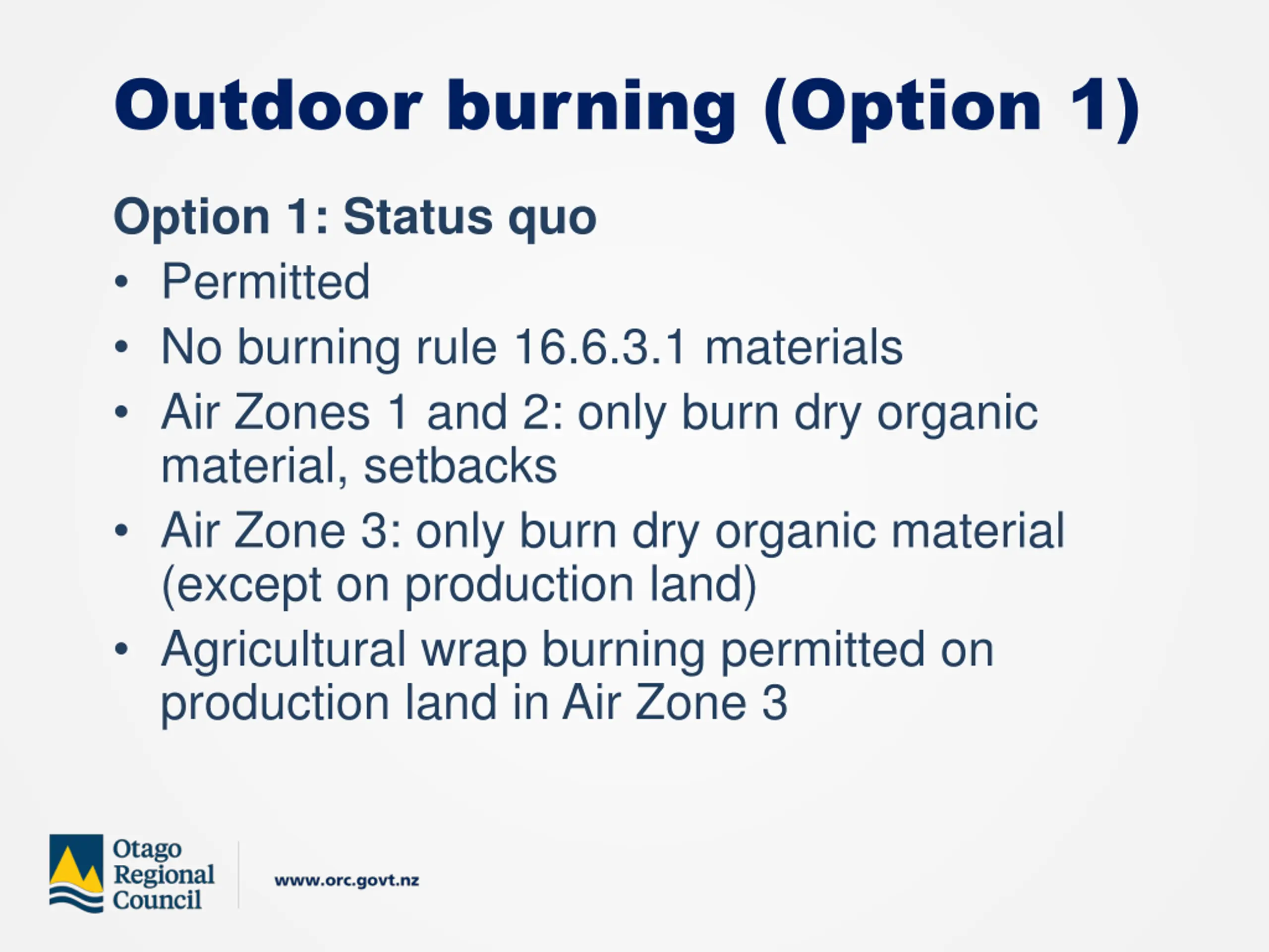Outdoor burning (Option 1) Option 1: Status quo Permitted No burning rule 16.6.3.1 materials Air Zones 1 and 2: only burn dry organic material, setbacks Air Zone 3: only burn dry organic material (except on production land) Agricultural wrap burning permitted on production land in Air Zone 3