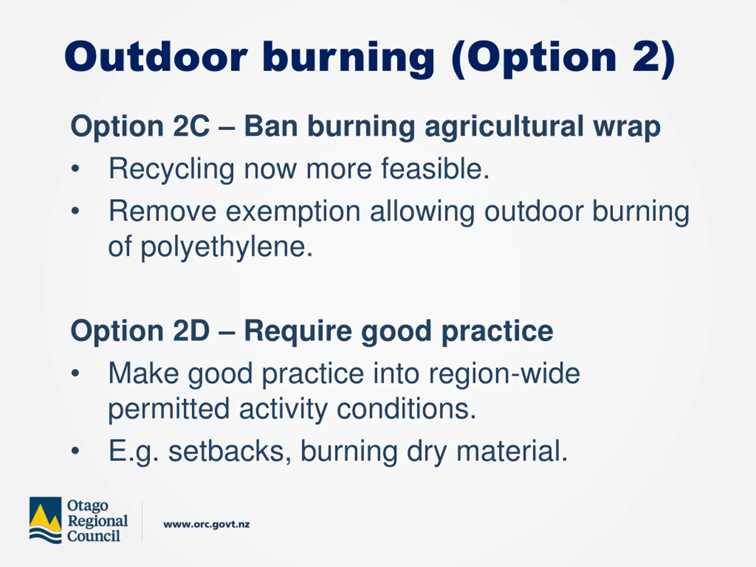 Outdoor burning (Option 2) Option 2C Ban burning agricultural wrap Recycling now more feasible. Remove exemption allowing outdoor burning of polyethylene. Option 2D Require good practice Make good practice into region-wide permitted activity conditions. E.g. setbacks, burning dry material.
