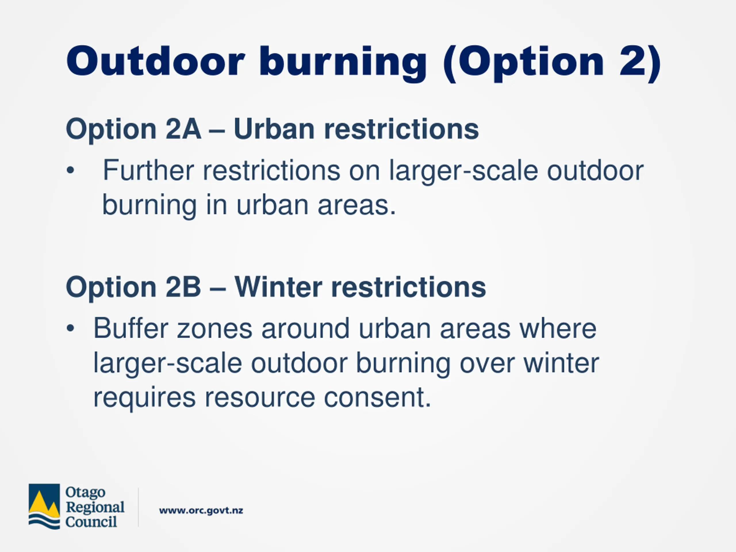 Outdoor burning (Option 2) Option 2A Urban restrictions Further restrictions on larger-scale outdoor burning in urban areas. Option 2B Winter restrictions Buffer zones around urban areas where larger-scale outdoor burning over winter requires resource consent.