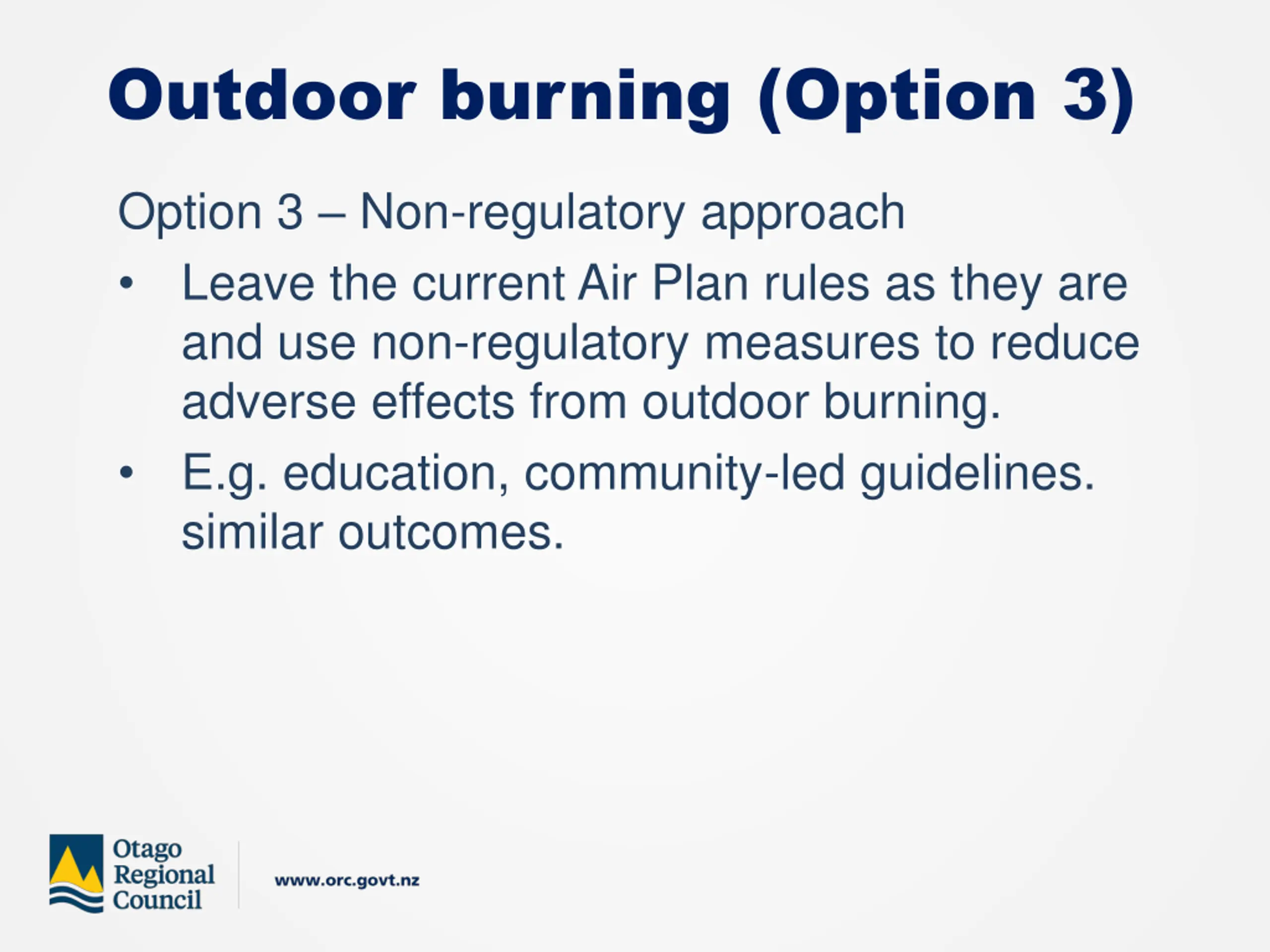 Outdoor burning (Option 3) Option 3 Non-regulatory approach Leave the current Air Plan rules as they are and use non-regulatory measures to reduce adverse effects from outdoor burning. E.g. education, community-led guidelines. similar outcomes.