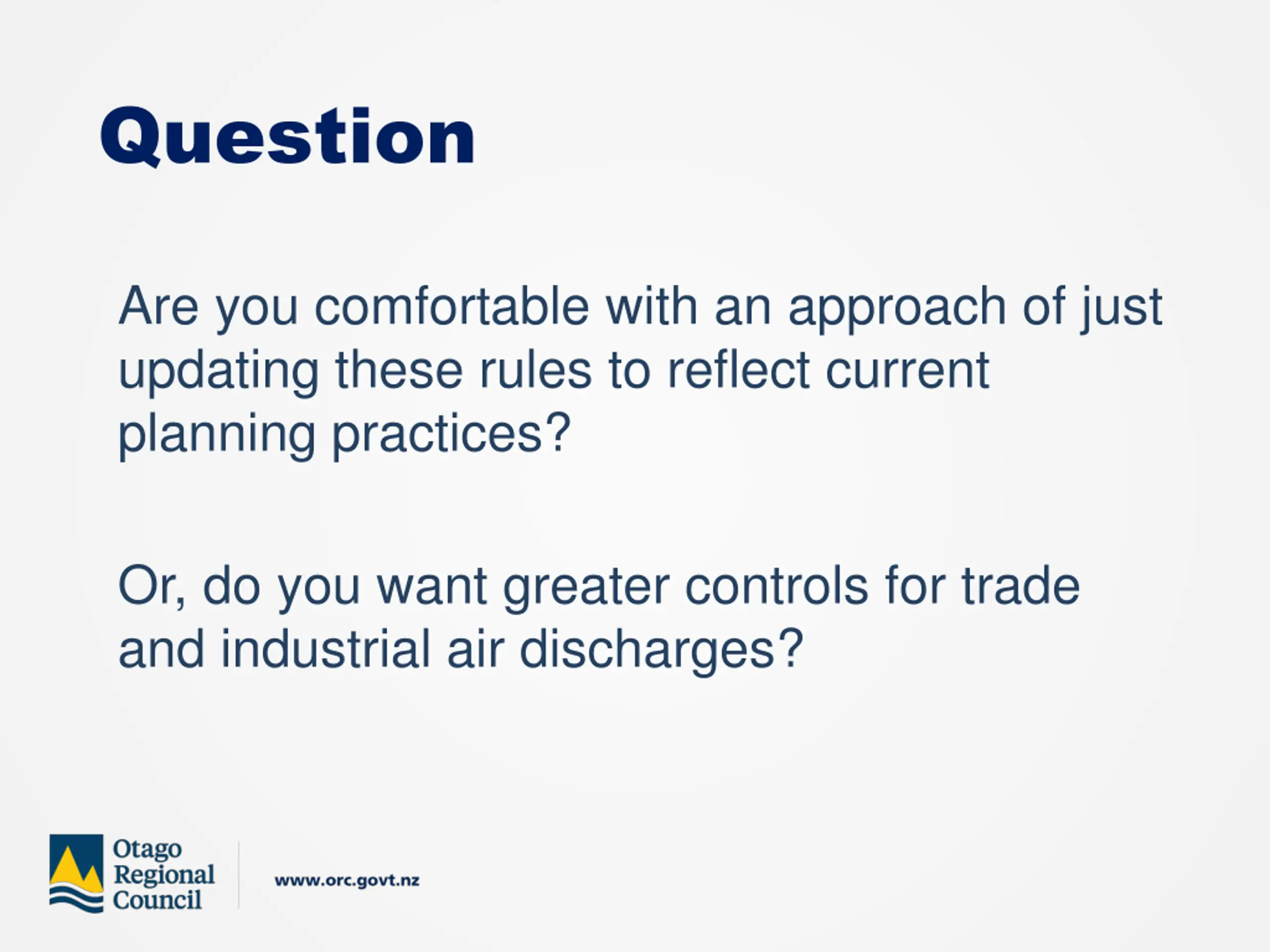 Question Are you comfortable with an approach of just updating these rules to reflect current planning practices? Or, do you want greater controls for trade and industrial air discharges?