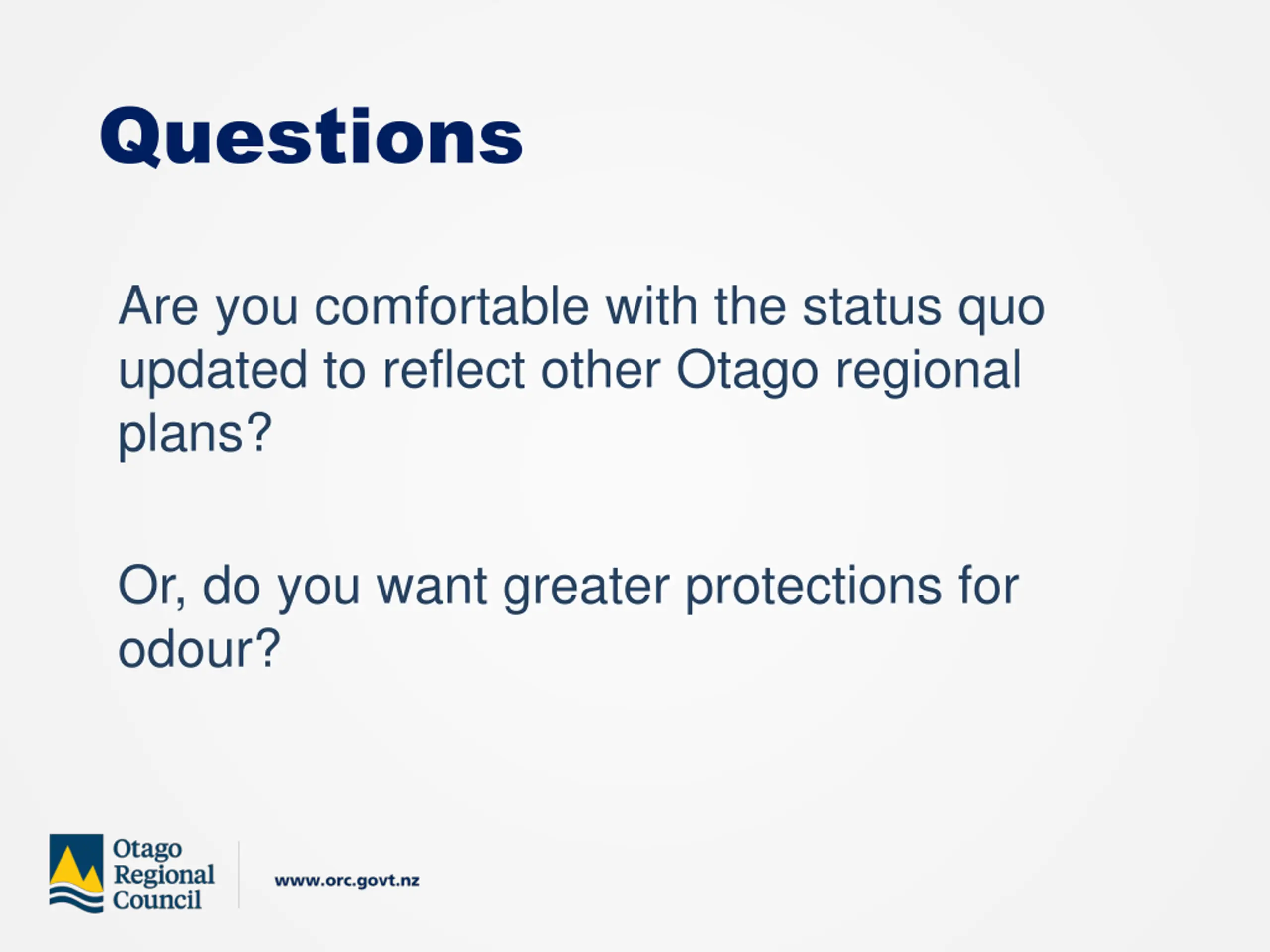 Questions Are you comfortable with the status quo updated to reflect other Otago regional plans? Or, do you want greater protections for odour?