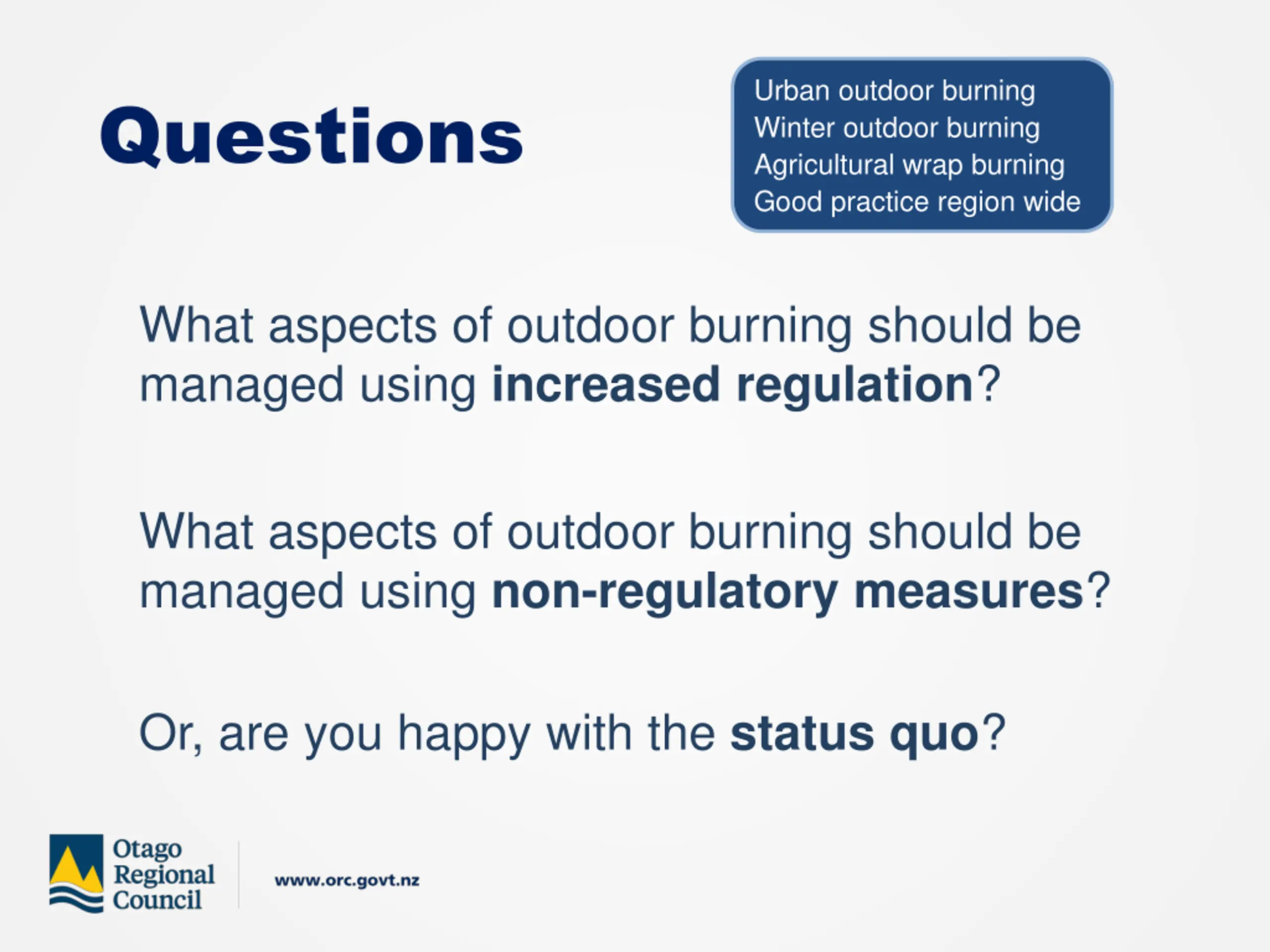 Urban outdoor burning Winter outdoor burning Agricultural wrap burning Good practice region wide Questions What aspects of outdoor burning should be managed using increased regulation? What aspects of outdoor burning should be managed using non-regulatory measures? Or, are you happy with the status quo?