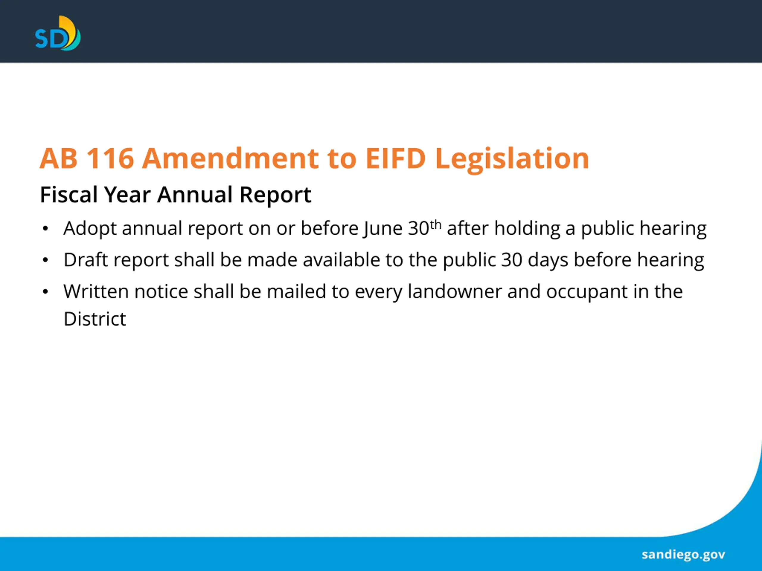 Otay Mesa Enhanced Infrastructure Financing District AB 116 Amendment to EIFD Legislation Fiscal Year Annual Report Adopt annual report on or before June 30th after holding a public hearing Draft report shall be made available to the public 30 days before hearing Written notice shall be mailed to every landowner and occupant in the District 2