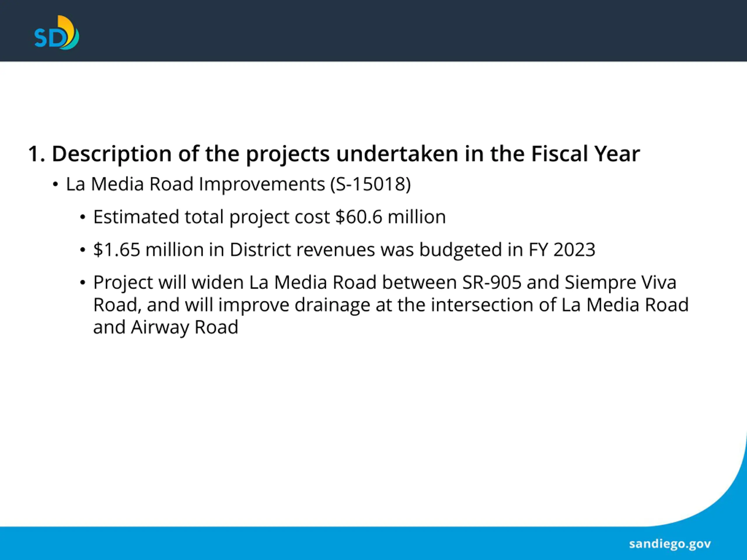 Otay Mesa Enhanced Infrastructure Financing District 1. Description of the projects undertaken in the Fiscal Year La Media Road Improvements (S-15018) Estimated total project cost $60.6 million $1.65 million in District revenues was budgeted in FY 2023 Project will widen La Media Road between SR-905 and Siempre Viva Road, and will improve drainage at the intersection of La Media Road and Airway Road 4