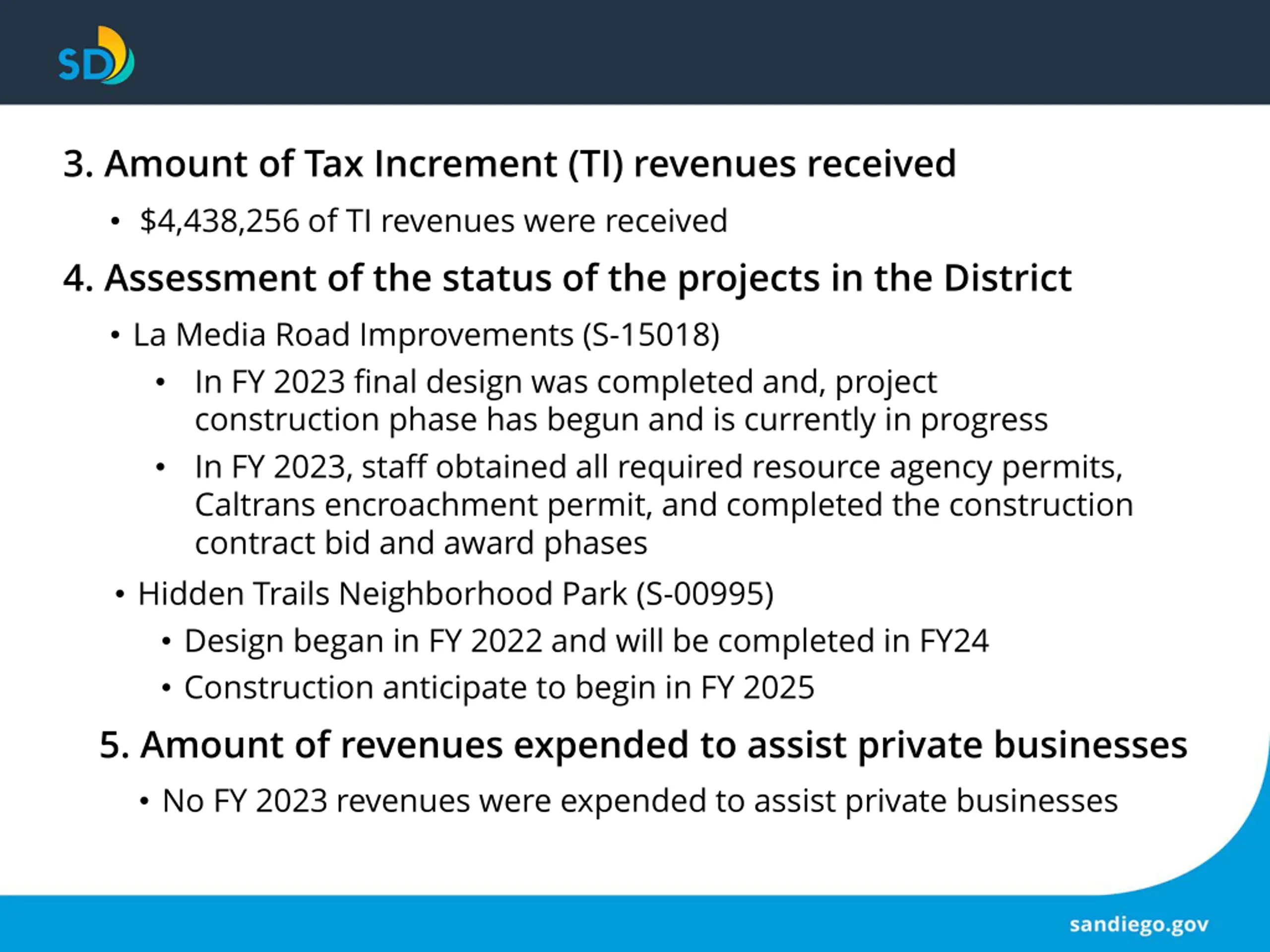 Otay Mesa Enhanced Infrastructure Financing District 3. Amount of Tax Increment (TI) revenues received $4,438,256 of TI revenues were received 4. Assessment of the status of the projects in the District La Media Road Improvements (S-15018) In FY 2023 final design was completed and, project construction phase has begun and is currently in progress In FY 2023, staff obtained all required resource agency permits, Caltrans encroachment permit, and completed the construction contract bid and award phases Hidden Trails Neighborhood Park (S-00995) Design began in FY 2022 and will be completed in FY24 Construction anticipate to begin in FY 2025 5. Amount of revenues expended to assist private businesses No FY 2023 revenues were expended to assist private businesses 7