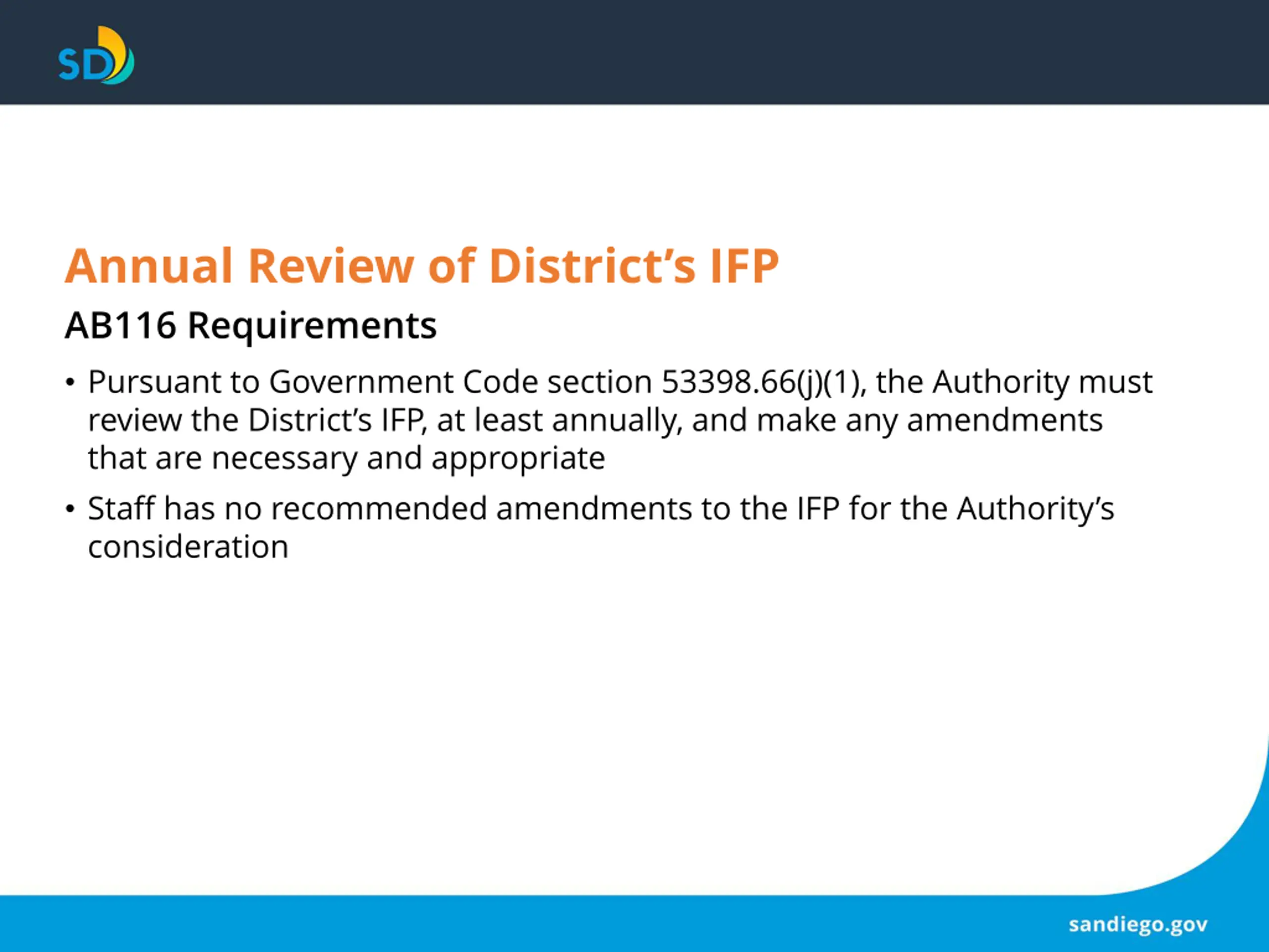 Otay Mesa Enhanced Infrastructure Financing District Annual Review of District s IFP AB116 Requirements Pursuant to Government Code section 53398.66(j)(1), the Authority must review the District s IFP, at least annually, and make any amendments that are necessary and appropriate Staff has no recommended amendments to the IFP for the Authority s consideration 8