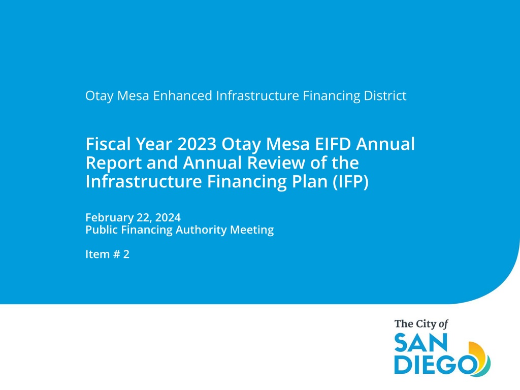 Otay Mesa Enhanced Infrastructure Financing District Fiscal Year 2023 Otay Mesa EIFD Annual Report and Annual Review of the Infrastructure Financing Plan (IFP) February 22, 2024 Public Financing Authority Meeting Item # 2