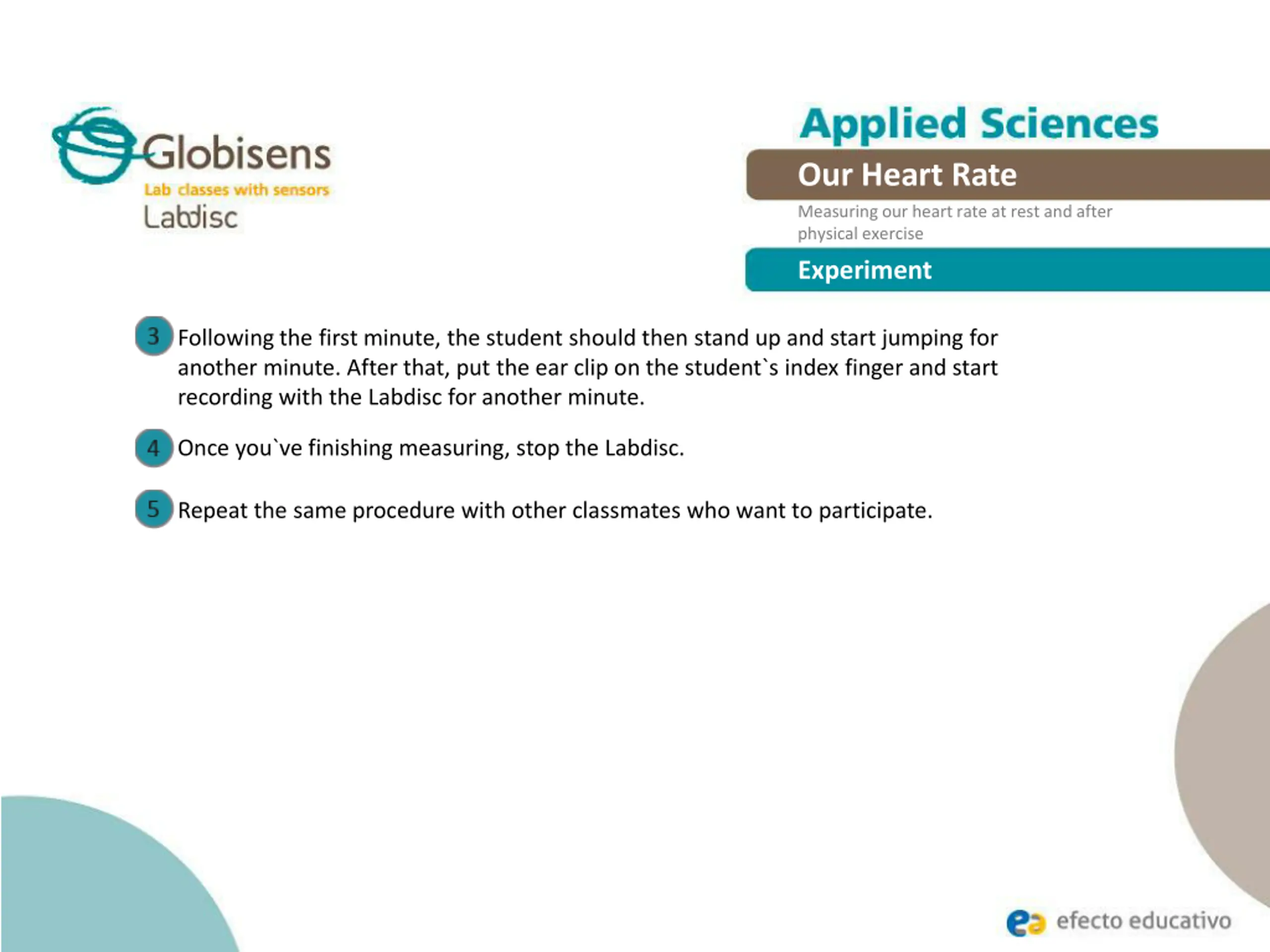 Our Heart Rate Measuring our heart rate at rest and after physical exercise Experiment Following the first minute, the student should then stand up and start jumping for another minute. After that, put the ear clip on the student`s index finger and start recording with the Labdisc for another minute. Once you`ve finishing measuring, stop the Labdisc. Repeat the same procedure with other classmates who want to participate.