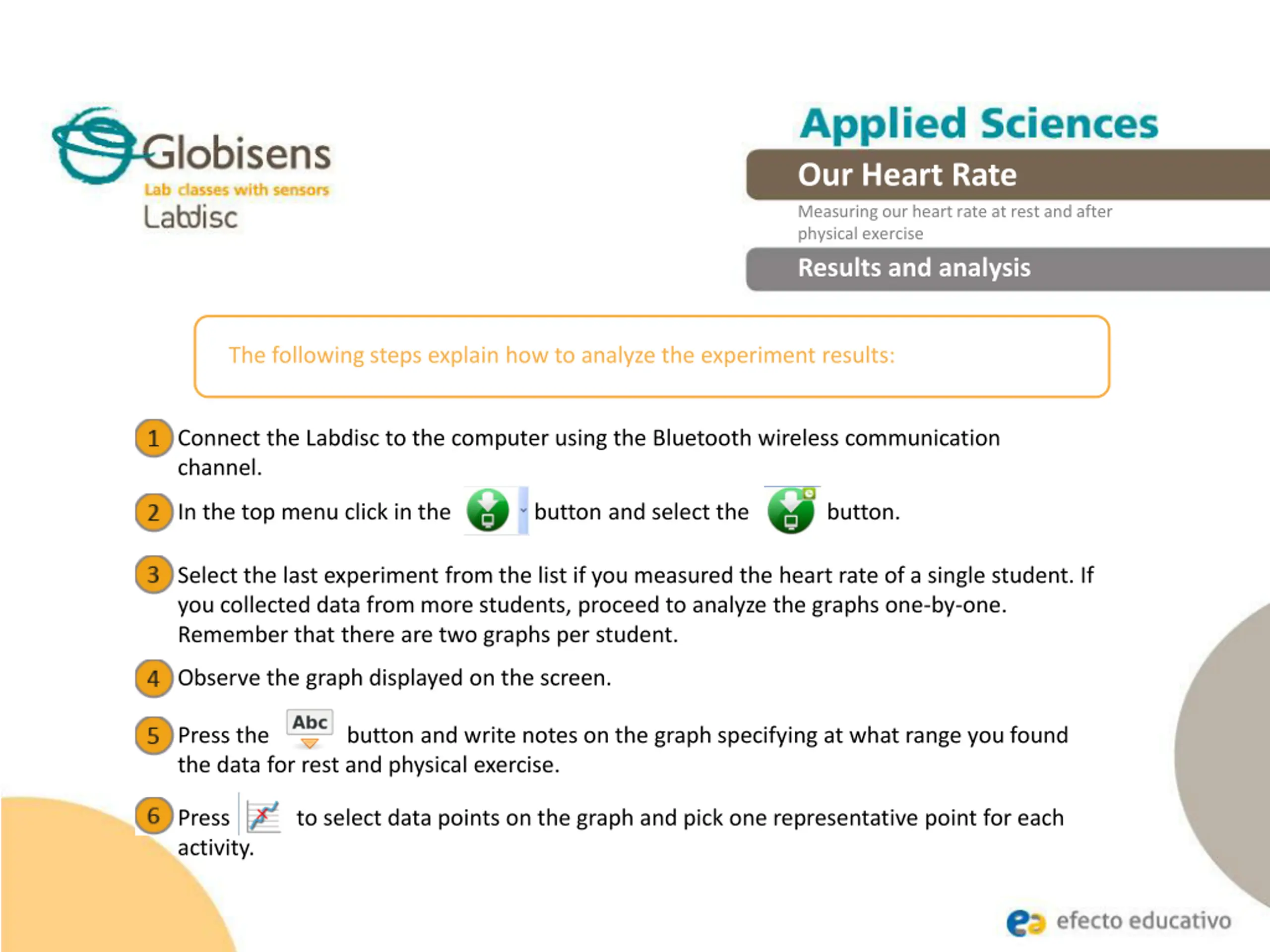 Our Heart Rate Measuring our heart rate at rest and after physical exercise Results and analysis The following steps explain how to analyze the experiment results: Connect the Labdisc to the computer using the Bluetooth wireless communication channel. In the top menu click in the button and select the button. Select the last experiment from the list if you measured the heart rate of a single student. If you collected data from more students, proceed to analyze the graphs one-by-one. Remember that there are two graphs per student. Observe the graph displayed on the screen. Press the button and write notes on the graph specifying at what range you found the data for rest and physical exercise. Press activity. to select data points on the graph and pick one representative point for each