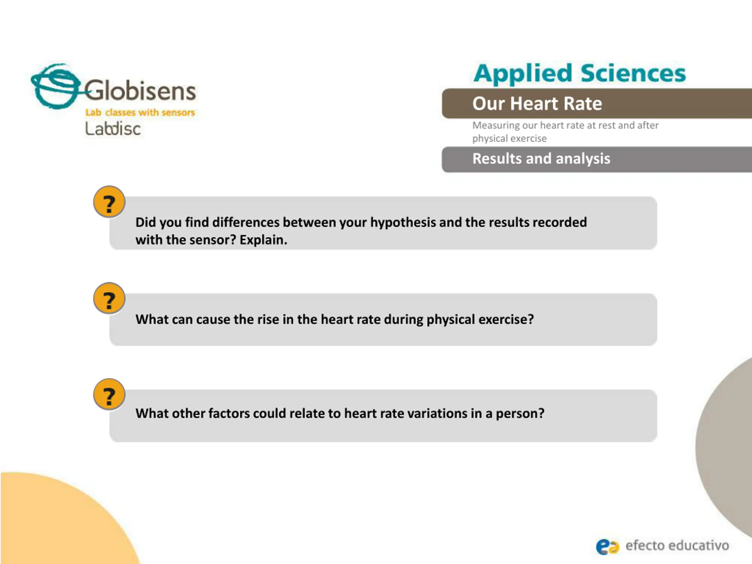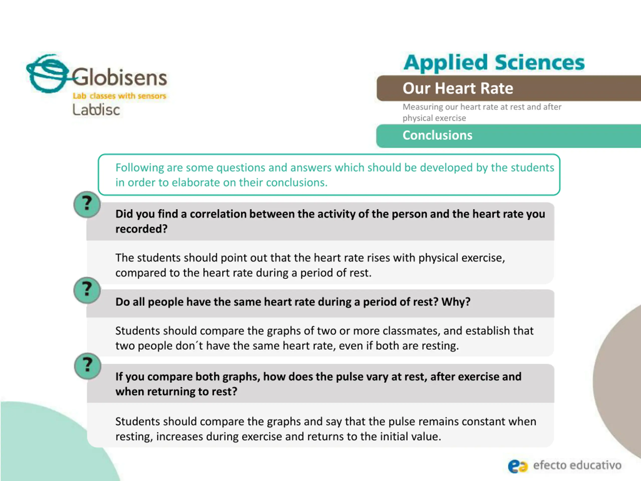 Our Heart Rate Measuring our heart rate at rest and after physical exercise Conclusions Following are some questions and answers which should be developed by the students in order to elaborate on their conclusions. Did you find a correlation between the activity of the person and the heart rate you recorded? The students should point out that the heart rate rises with physical exercise, compared to the heart rate during a period of rest. Do all people have the same heart rate during a period of rest? Why? Students should compare the graphs of two or more classmates, and establish that two people don t have the same heart rate, even if both are resting. If you compare both graphs, how does the pulse vary at rest, after exercise and when returning to rest? Students should compare the graphs and say that the pulse remains constant when resting, increases during exercise and returns to the initial value.