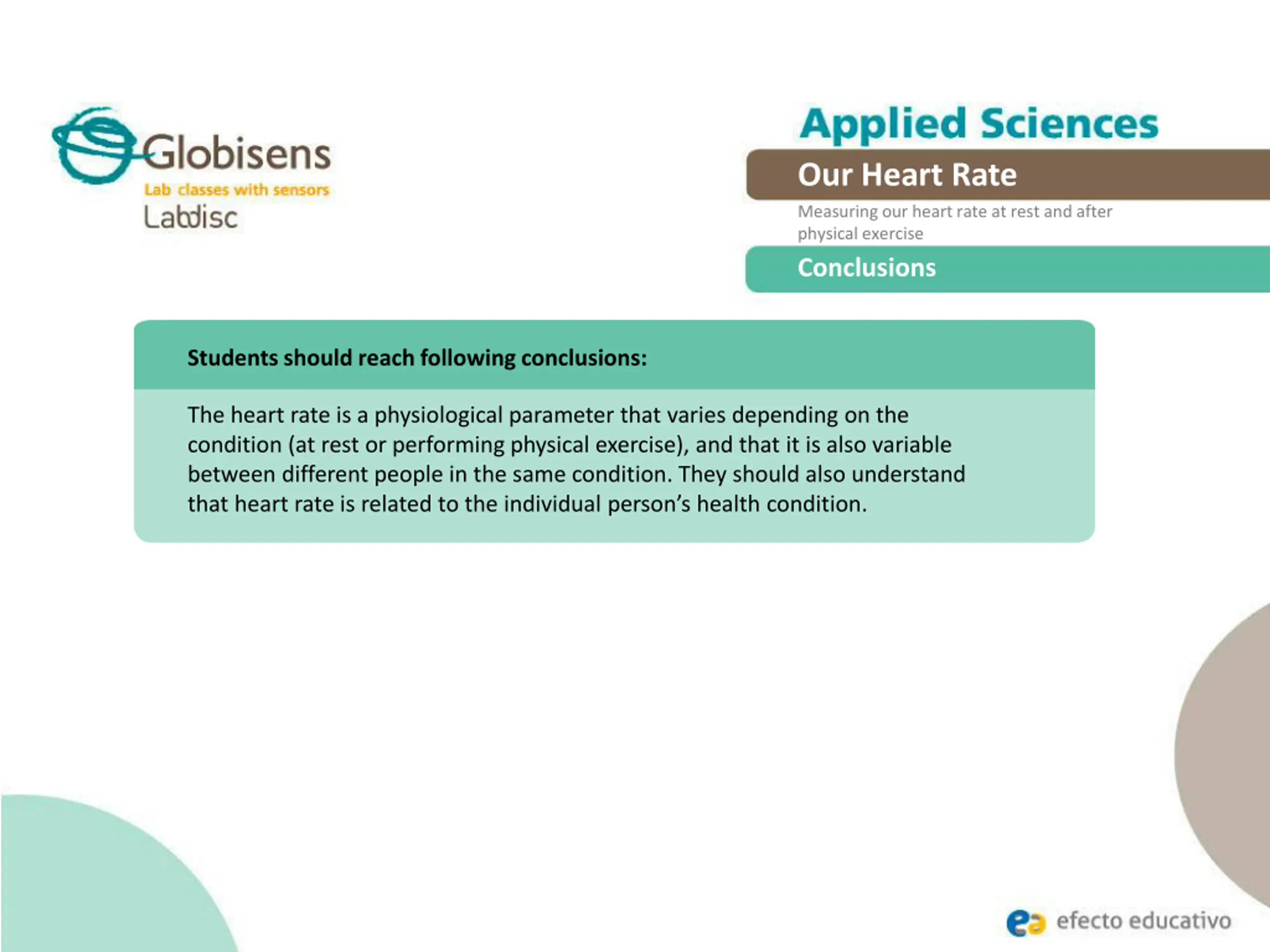 Our Heart Rate Measuring our heart rate at rest and after physical exercise Conclusions Students should reach following conclusions: The heart rate is a physiological parameter that varies depending on the condition (at rest or performing physical exercise), and that it is also variable between different people in the same condition. They should also understand that heart rate is related to the individual person s health condition.