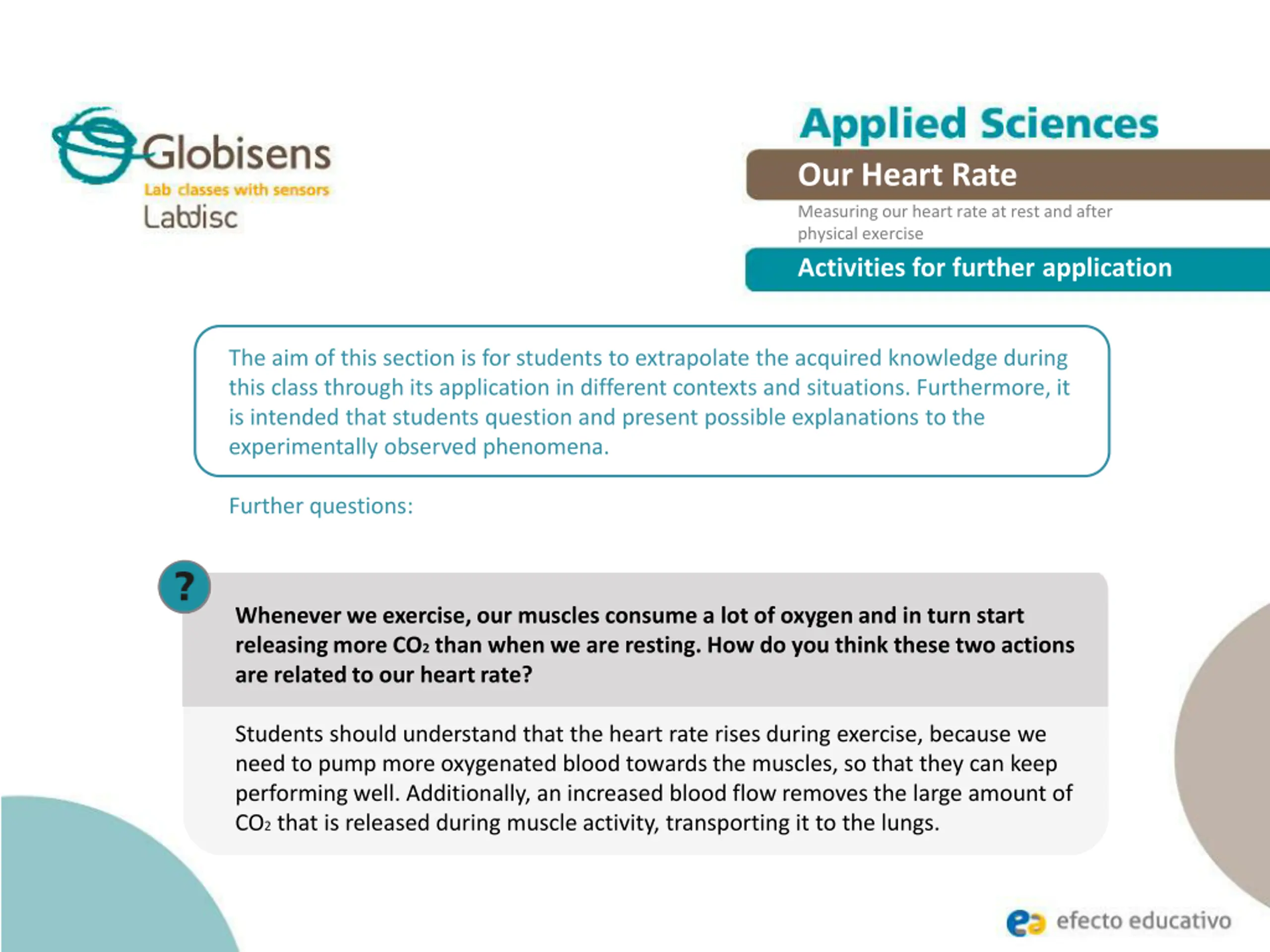 Our Heart Rate Measuring our heart rate at rest and after physical exercise Activities for further application The aim of this section is for students to extrapolate the acquired knowledge during this class through its application in different contexts and situations. Furthermore, it is intended that students question and present possible explanations to the experimentally observed phenomena. Further questions: Whenever we exercise, our muscles consume a lot of oxygen and in turn start releasing more CO2 than when we are resting. How do you think these two actions are related to our heart rate? Students should understand that the heart rate rises during exercise, because we need to pump more oxygenated blood towards the muscles, so that they can keep performing well. Additionally, an increased blood flow removes the large amount of CO2 that is released during muscle activity, transporting it to the lungs.