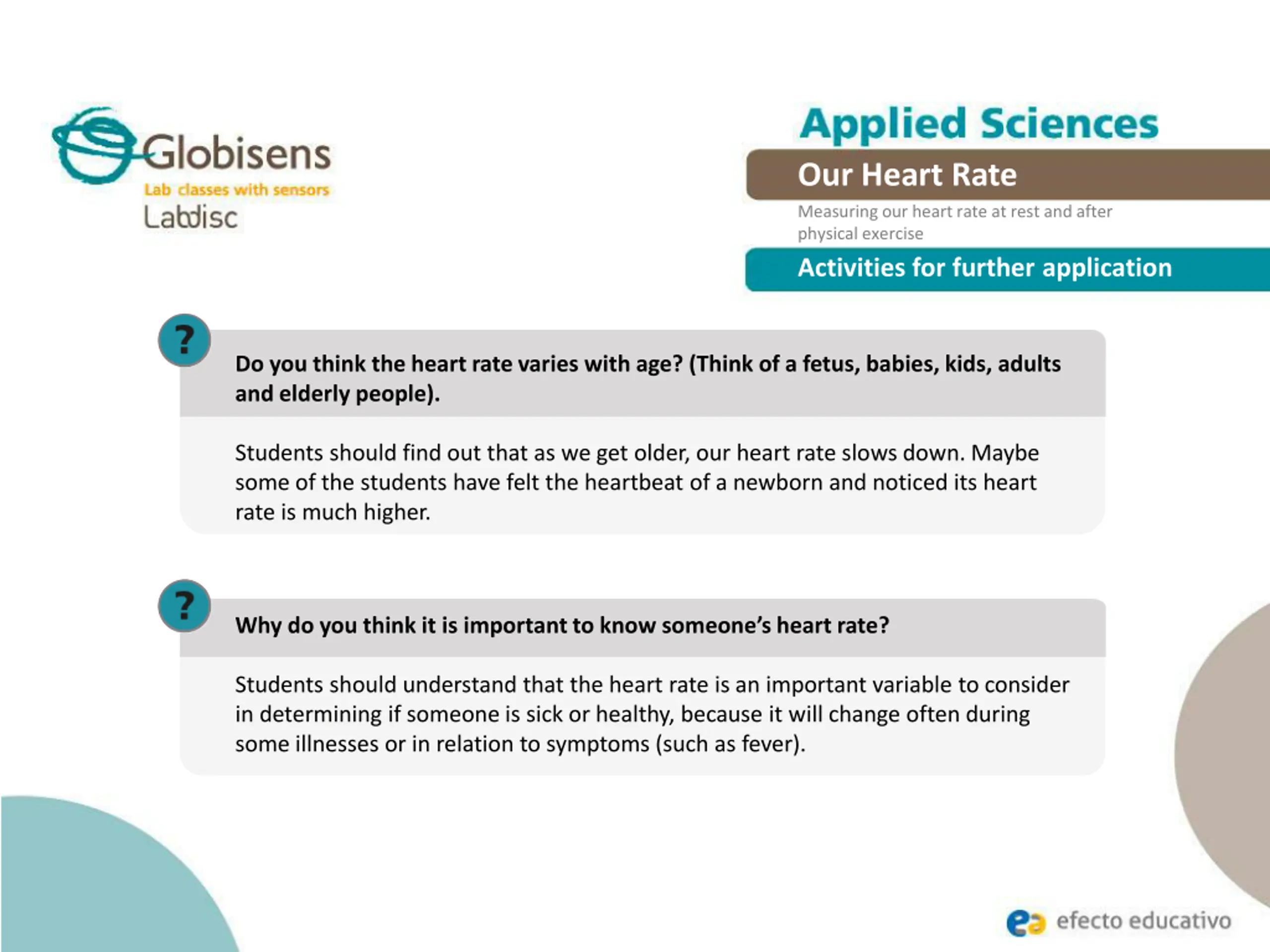 Our Heart Rate Measuring our heart rate at rest and after physical exercise Activities for further application Do you think the heart rate varies with age? (Think of a fetus, babies, kids, adults and elderly people). Students should find out that as we get older, our heart rate slows down. Maybe some of the students have felt the heartbeat of a newborn and noticed its heart rate is much higher. Why do you think it is important to know someone s heart rate? Students should understand that the heart rate is an important variable to consider in determining if someone is sick or healthy, because it will change often during some illnesses or in relation to symptoms (such as fever).
