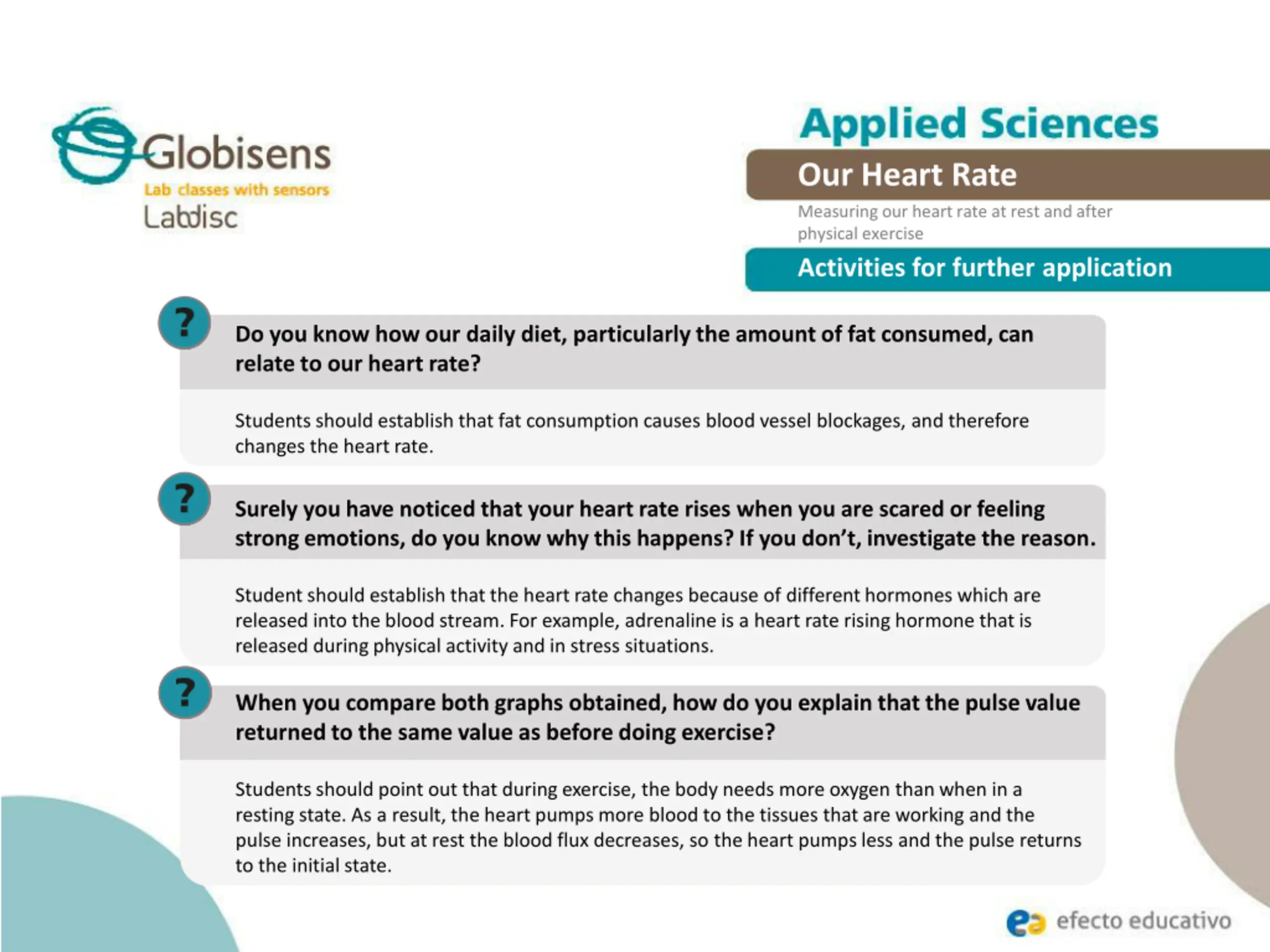 Our Heart Rate Measuring our heart rate at rest and after physical exercise Activities for further application Do you know how our daily diet, particularly the amount of fat consumed, can relate to our heart rate? Students should establish that fat consumption causes blood vessel blockages, and therefore changes the heart rate. Surely you have noticed that your heart rate rises when you are scared or feeling strong emotions, do you know why this happens? If you don t, investigate the reason. Student should establish that the heart rate changes because of different hormones which are released into the blood stream. For example, adrenaline is a heart rate rising hormone that is released during physical activity and in stress situations. When you compare both graphs obtained, how do you explain that the pulse value returned to the same value as before doing exercise? Students should point out that during exercise, the body needs more oxygen than when in a resting state. As a result, the heart pumps more blood to the tissues that are working and the pulse increases, but at rest the blood flux decreases, so the heart pumps less and the pulse returns to the initial state.