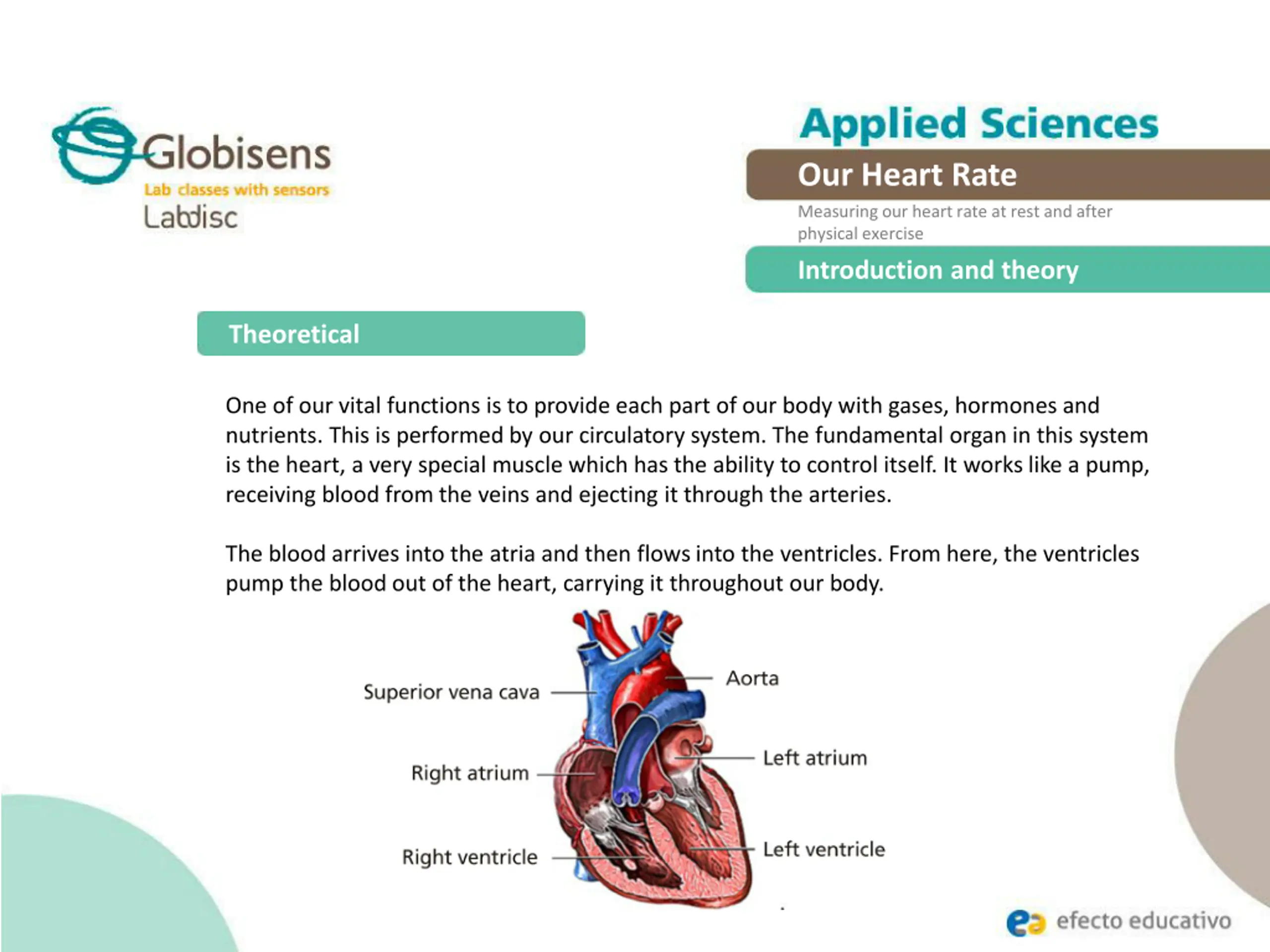 Our Heart Rate Measuring our heart rate at rest and after physical exercise Introduction and theory Theoretical One of our vital functions is to provide each part of our body with gases, hormones and nutrients. This is performed by our circulatory system. The fundamental organ in this system is the heart, a very special muscle which has the ability to control itself. It works like a pump, receiving blood from the veins and ejecting it through the arteries. The blood arrives into the atria and then flows into the ventricles. From here, the ventricles pump the blood out of the heart, carrying it throughout our body.