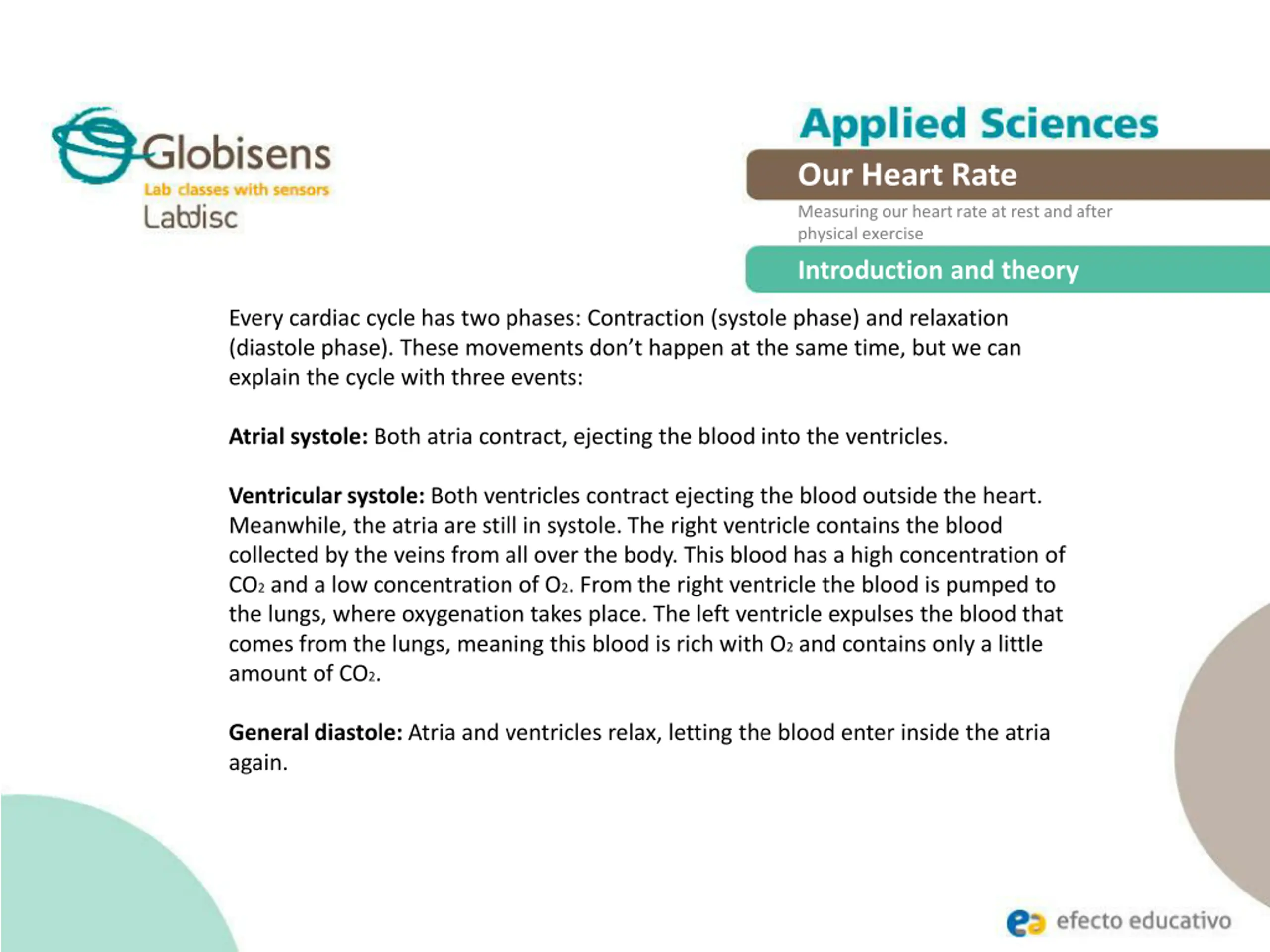 Our Heart Rate Measuring our heart rate at rest and after physical exercise Introduction and theory Every cardiac cycle has two phases: Contraction (systole phase) and relaxation (diastole phase). These movements don t happen at the same time, but we can explain the cycle with three events: Atrial systole: Both atria contract, ejecting the blood into the ventricles. Ventricular systole: Both ventricles contract ejecting the blood outside the heart. Meanwhile, the atria are still in systole. The right ventricle contains the blood collected by the veins from all over the body. This blood has a high concentration of CO2 and a low concentration of O2. From the right ventricle the blood is pumped to the lungs, where oxygenation takes place. The left ventricle expulses the blood that comes from the lungs, meaning this blood is rich with O2 and contains only a little amount of CO2. General diastole: Atria and ventricles relax, letting the blood enter inside the atria again.