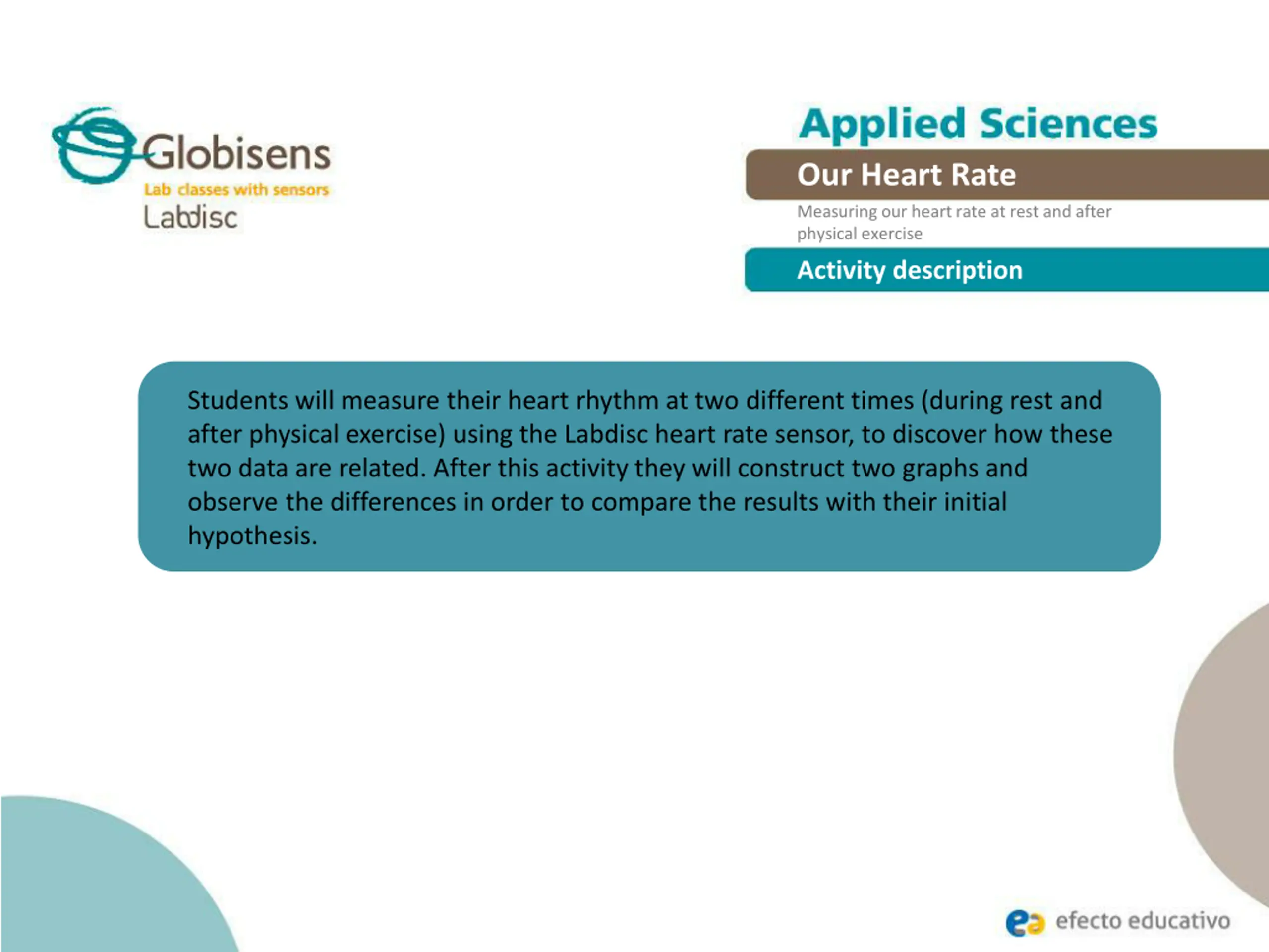 Our Heart Rate Measuring our heart rate at rest and after physical exercise Activity description Students will measure their heart rhythm at two different times (during rest and after physical exercise) using the Labdisc heart rate sensor, to discover how these two data are related. After this activity they will construct two graphs and observe the differences in order to compare the results with their initial hypothesis.