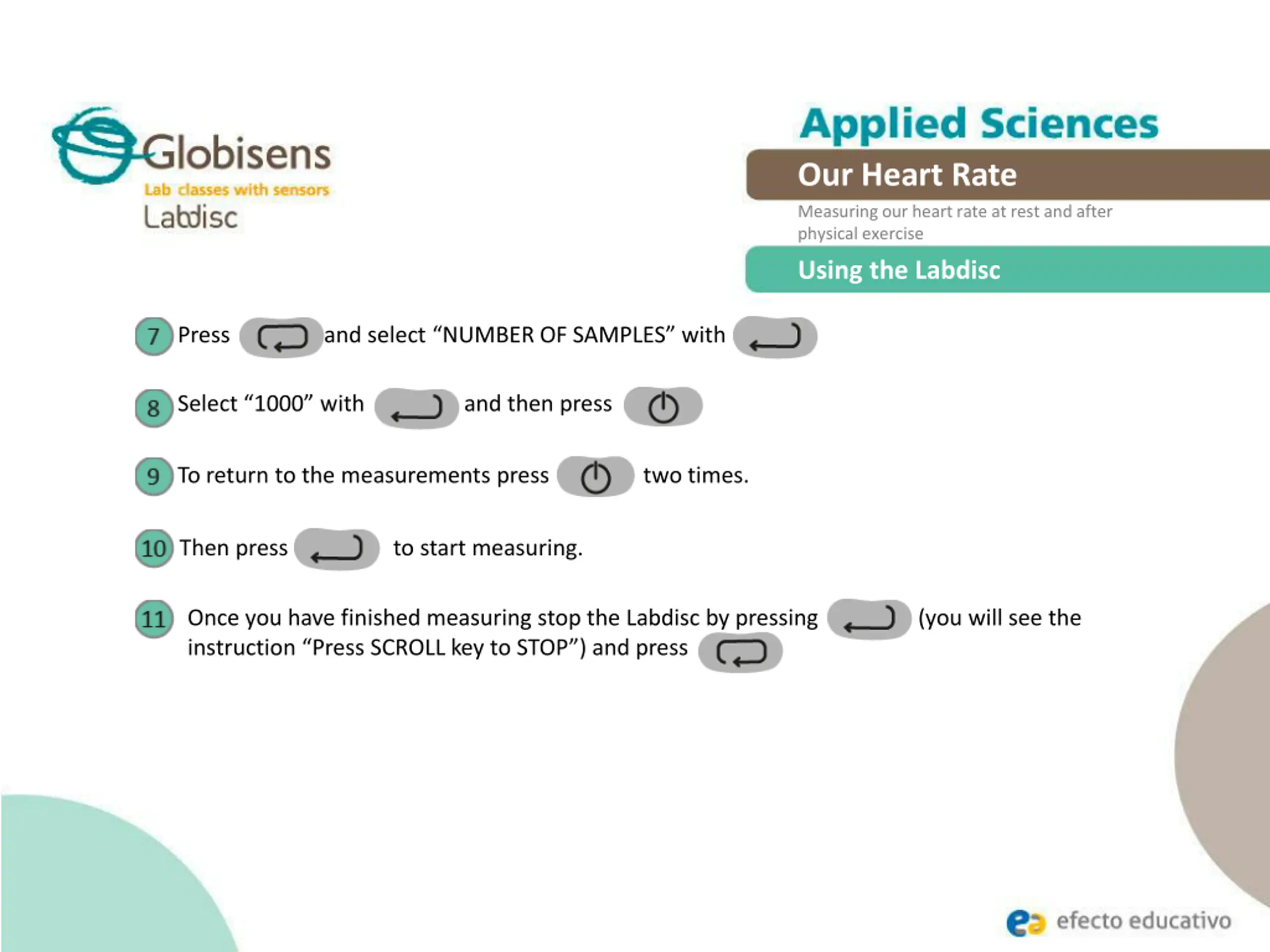 Our Heart Rate Measuring our heart rate at rest and after physical exercise Using the Labdisc Press and select NUMBER OF SAMPLES with Select 1000 with and then press To return to the measurements press two times. Then press to start measuring. Once you have finished measuring stop the Labdisc by pressing instruction Press SCROLL key to STOP ) and press (you will see the