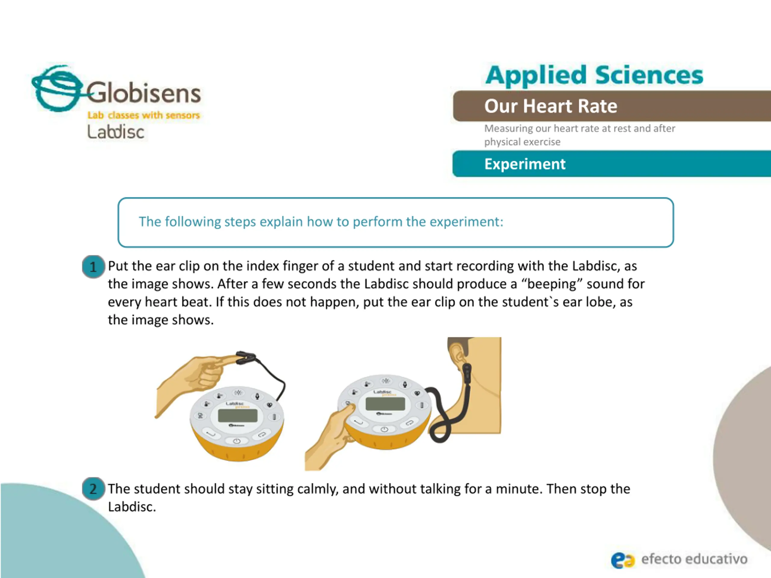 Our Heart Rate Measuring our heart rate at rest and after physical exercise Experiment The following steps explain how to perform the experiment: Put the ear clip on the index finger of a student and start recording with the Labdisc, as the image shows. After a few seconds the Labdisc should produce a beeping sound for every heart beat. If this does not happen, put the ear clip on the student`s ear lobe, as the image shows. The student should stay sitting calmly, and without talking for a minute. Then stop the Labdisc.