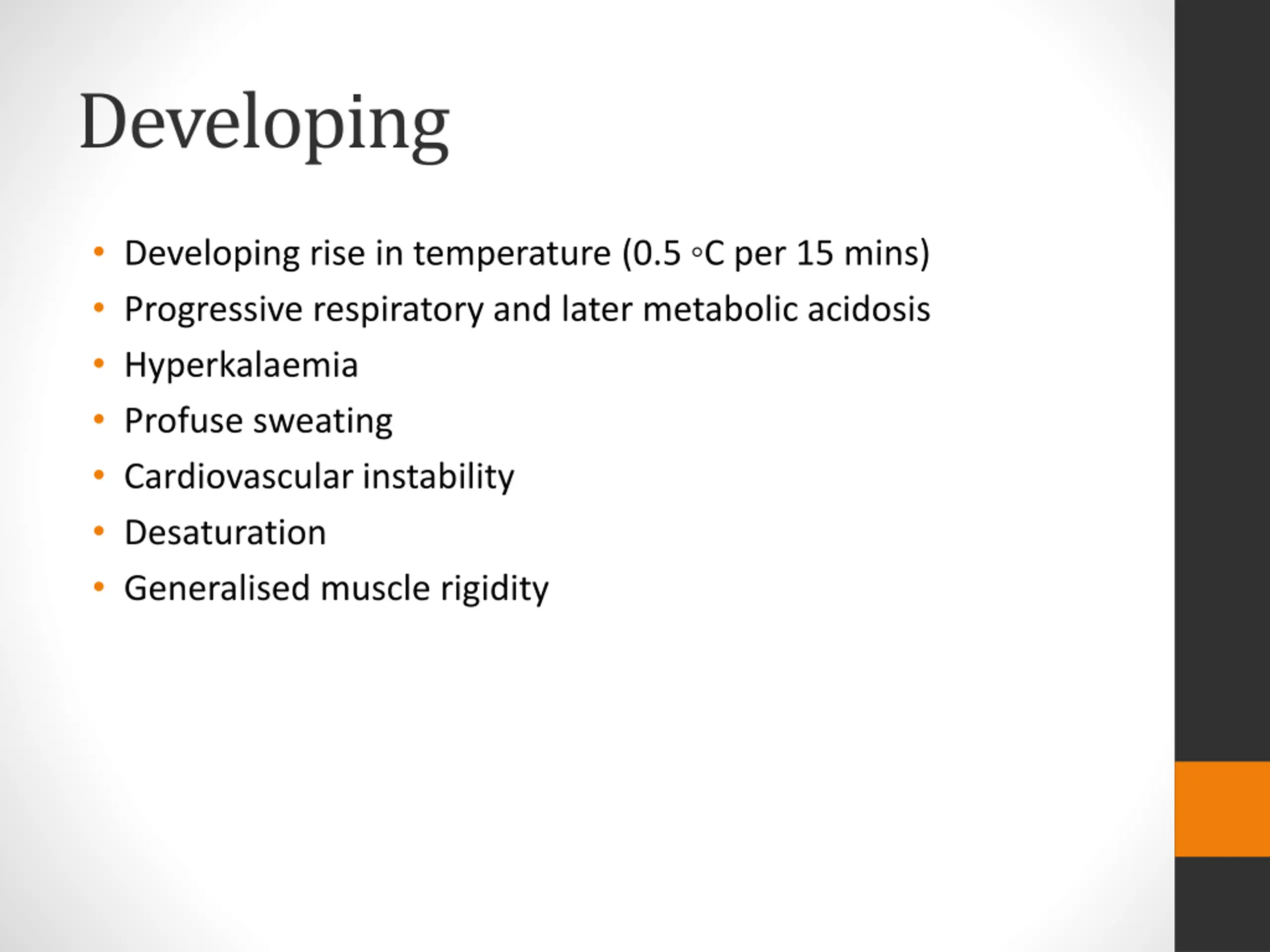 Developing Developing rise in temperature (0.5 C per 15 mins) Progressive respiratory and later metabolic acidosis Hyperkalaemia Profuse sweating Cardiovascular instability Desaturation Generalised muscle rigidity