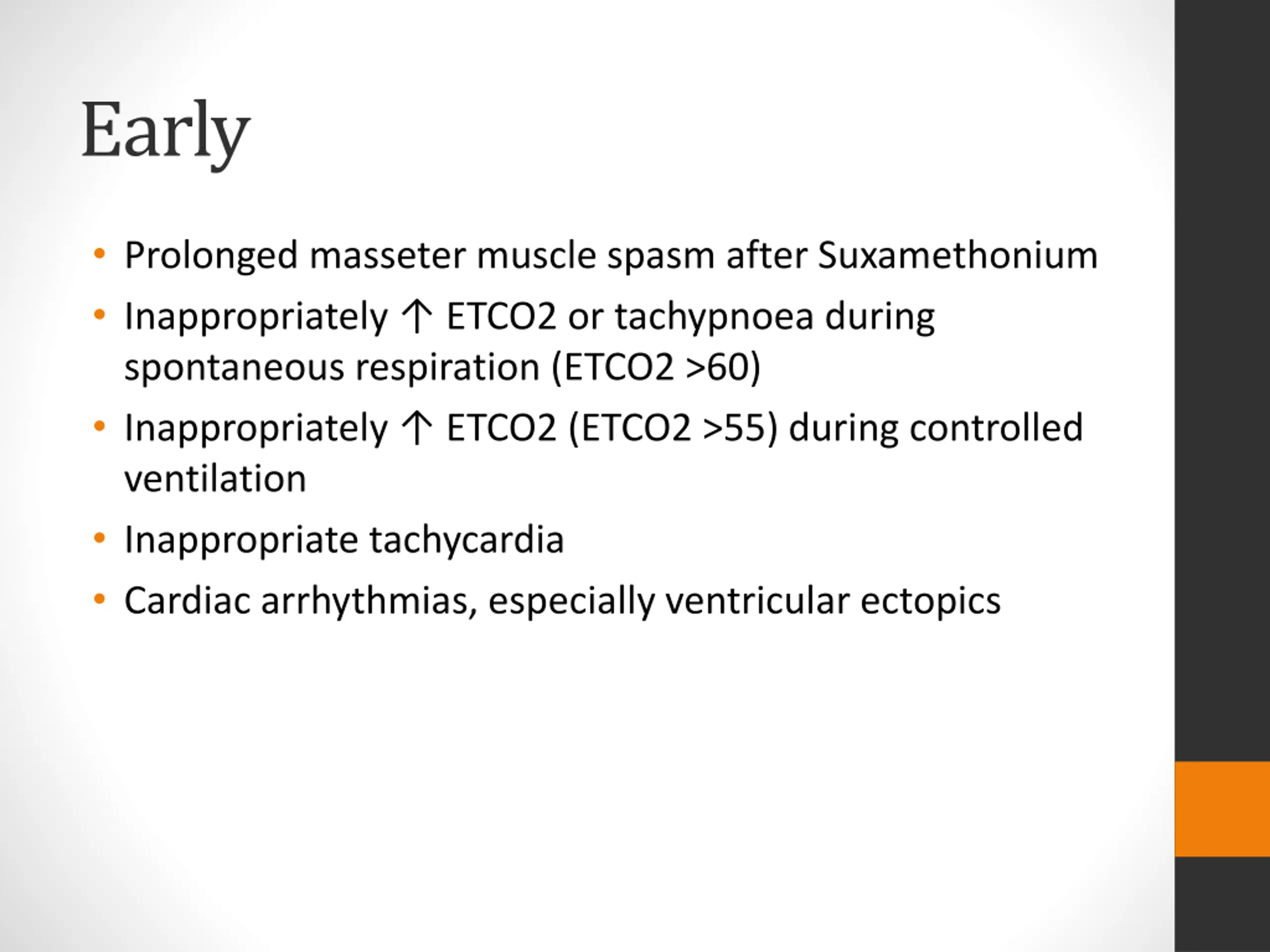 Early Prolonged masseter muscle spasm after Suxamethonium Inappropriately ETCO2 or tachypnoea during spontaneous respiration (ETCO2 >60) Inappropriately ETCO2 (ETCO2 >55) during controlled ventilation Inappropriate tachycardia Cardiac arrhythmias, especially ventricular ectopics