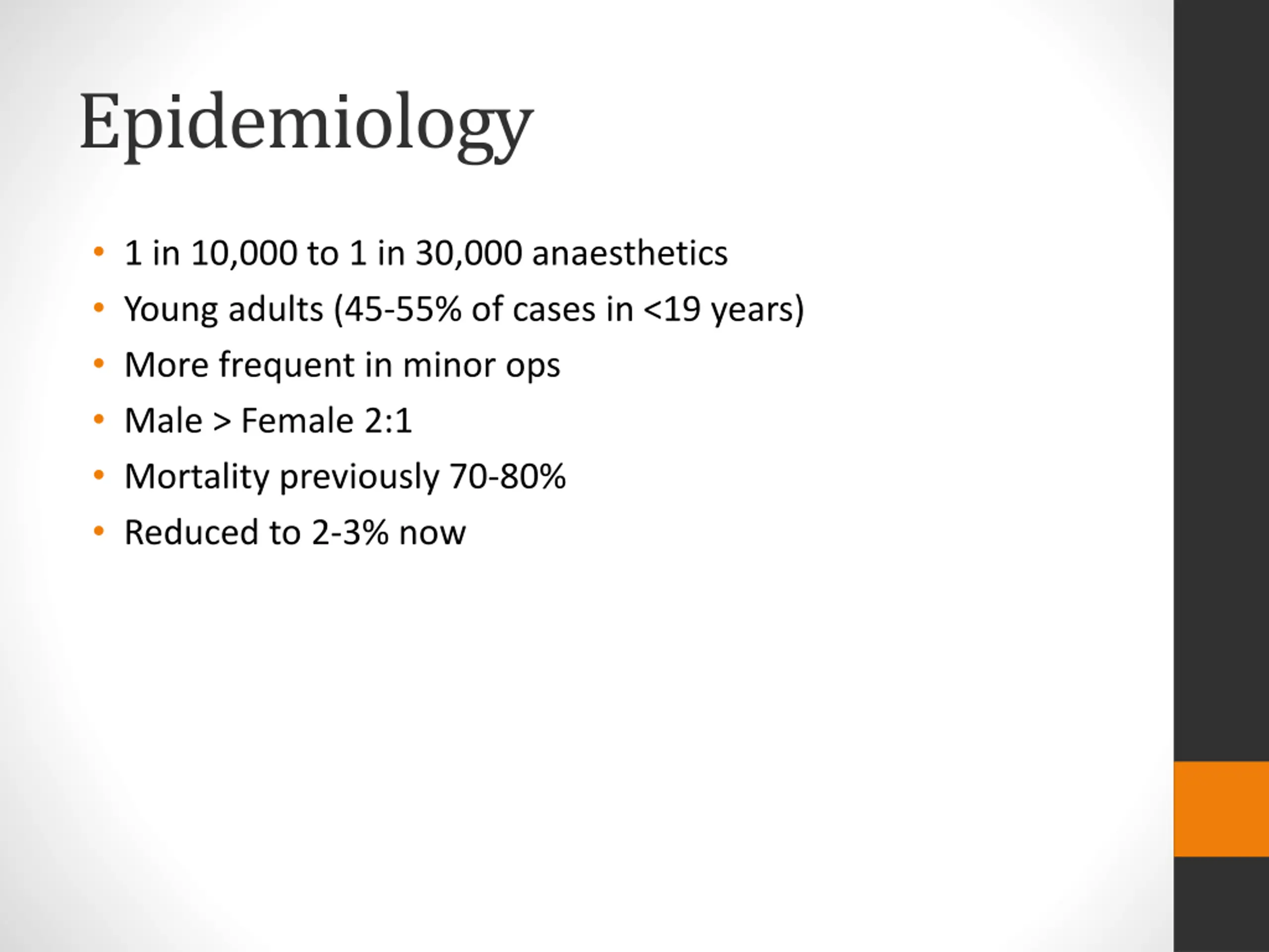 Epidemiology 1 in 10,000 to 1 in 30,000 anaesthetics Young adults (45-55% of cases in <19 years) More frequent in minor ops Male > Female 2:1 Mortality previously 70-80% Reduced to 2-3% now