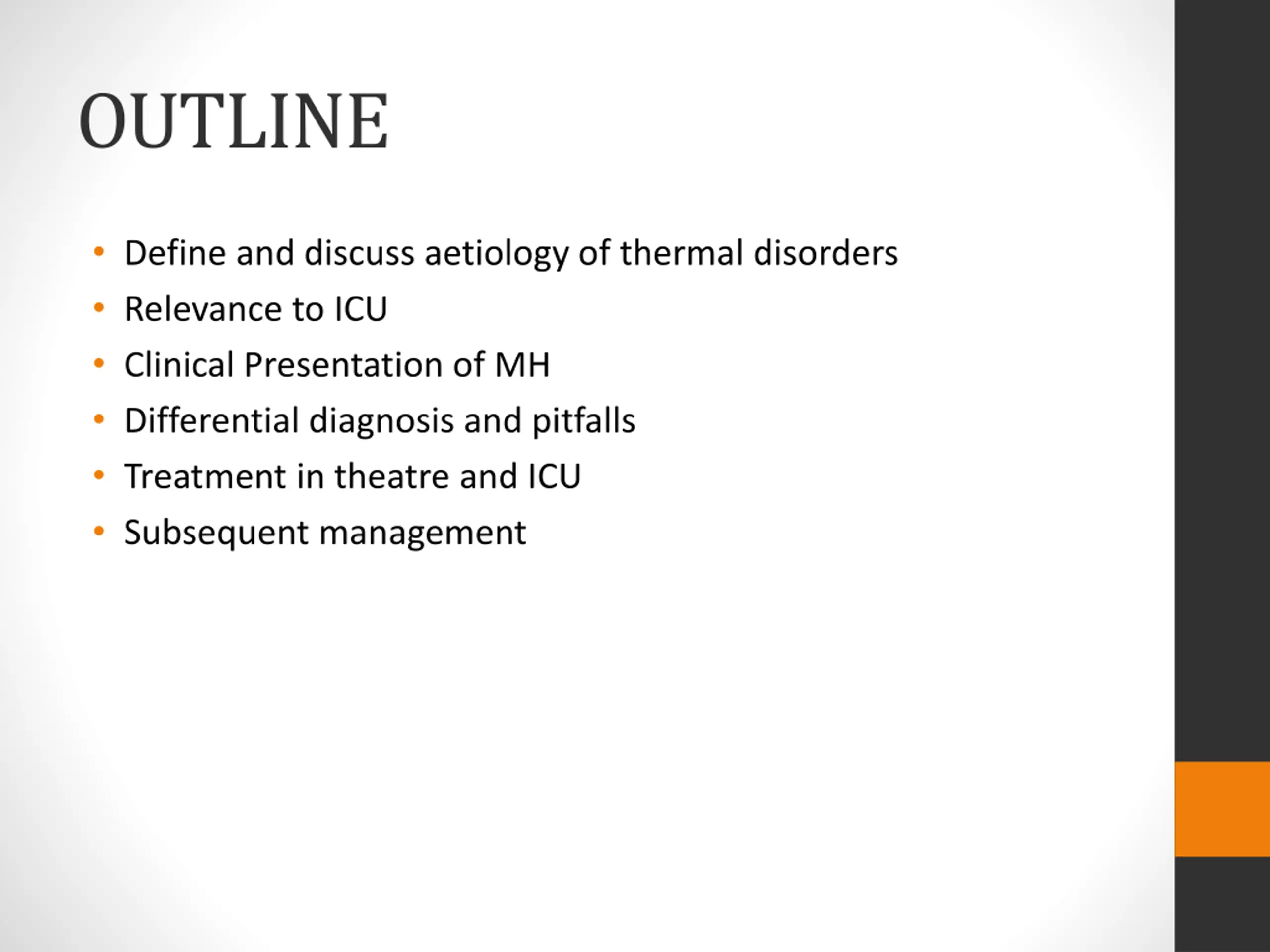 OUTLINE Define and discuss aetiology of thermal disorders Relevance to ICU Clinical Presentation of MH Differential diagnosis and pitfalls Treatment in theatre and ICU Subsequent management
