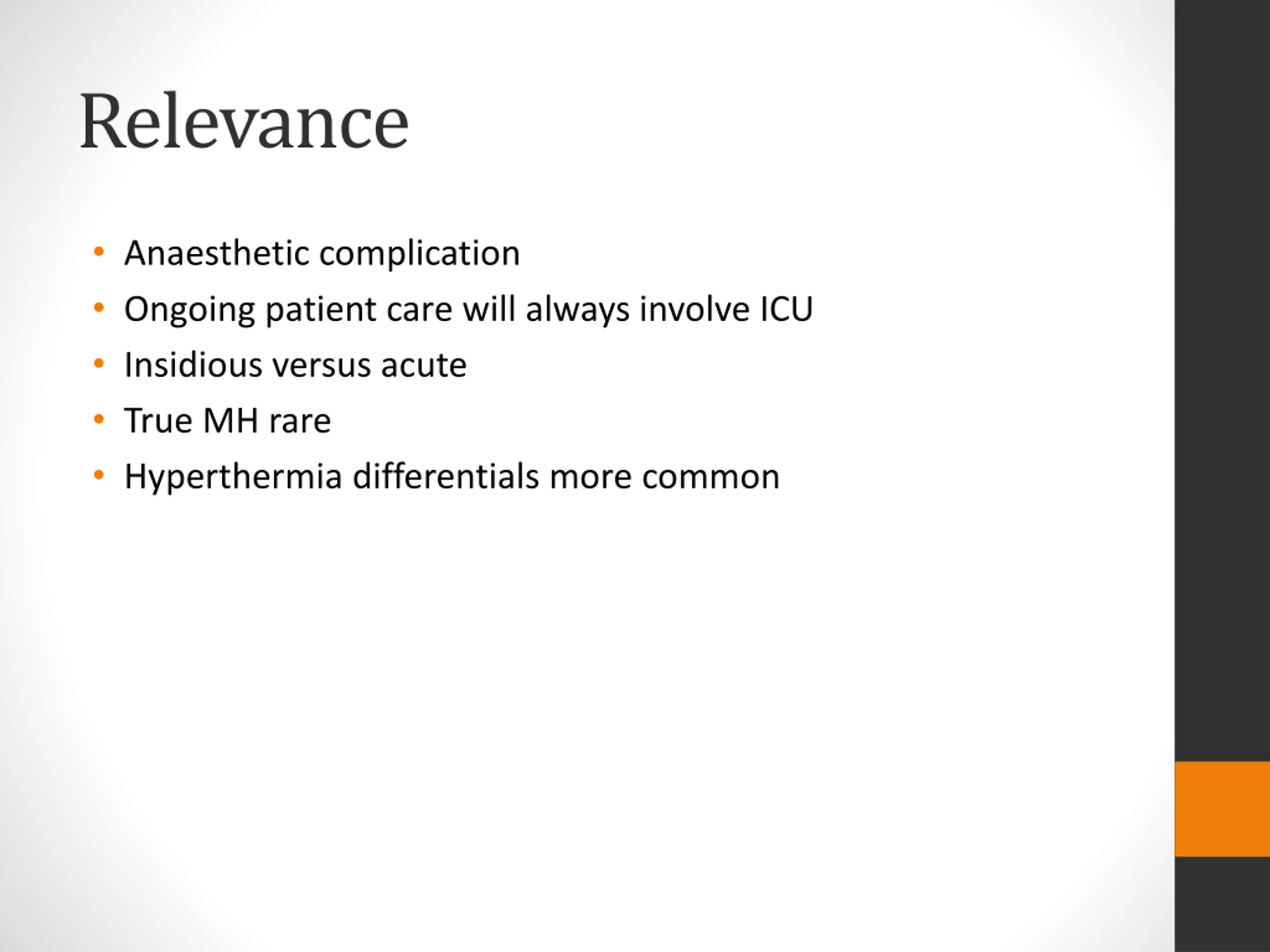 Relevance Anaesthetic complication Ongoing patient care will always involve ICU Insidious versus acute True MH rare Hyperthermia differentials more common