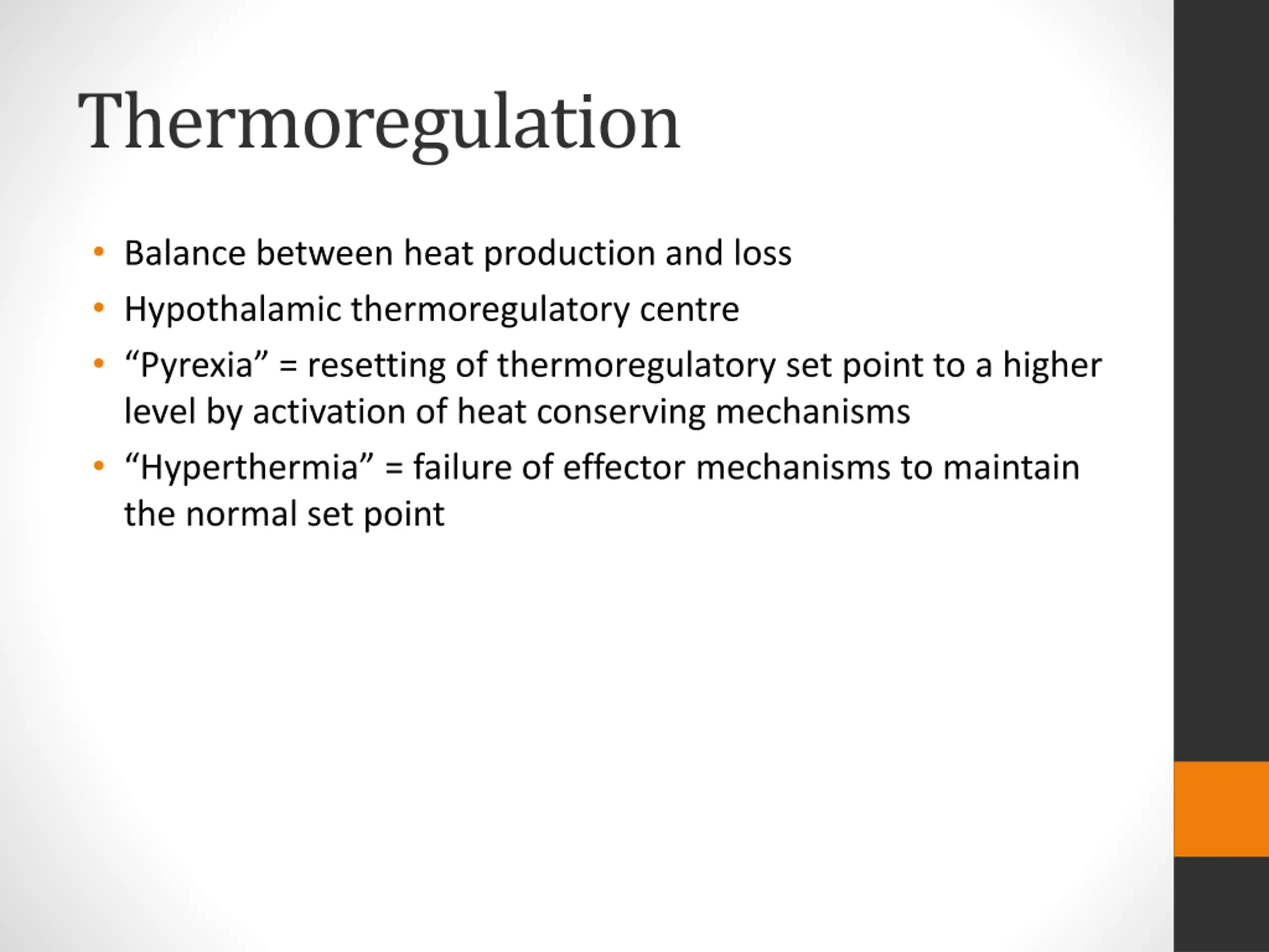 Thermoregulation Balance between heat production and loss Hypothalamic thermoregulatory centre Pyrexia = resetting of thermoregulatory set point to a higher level by activation of heat conserving mechanisms Hyperthermia = failure of effector mechanisms to maintain the normal set point