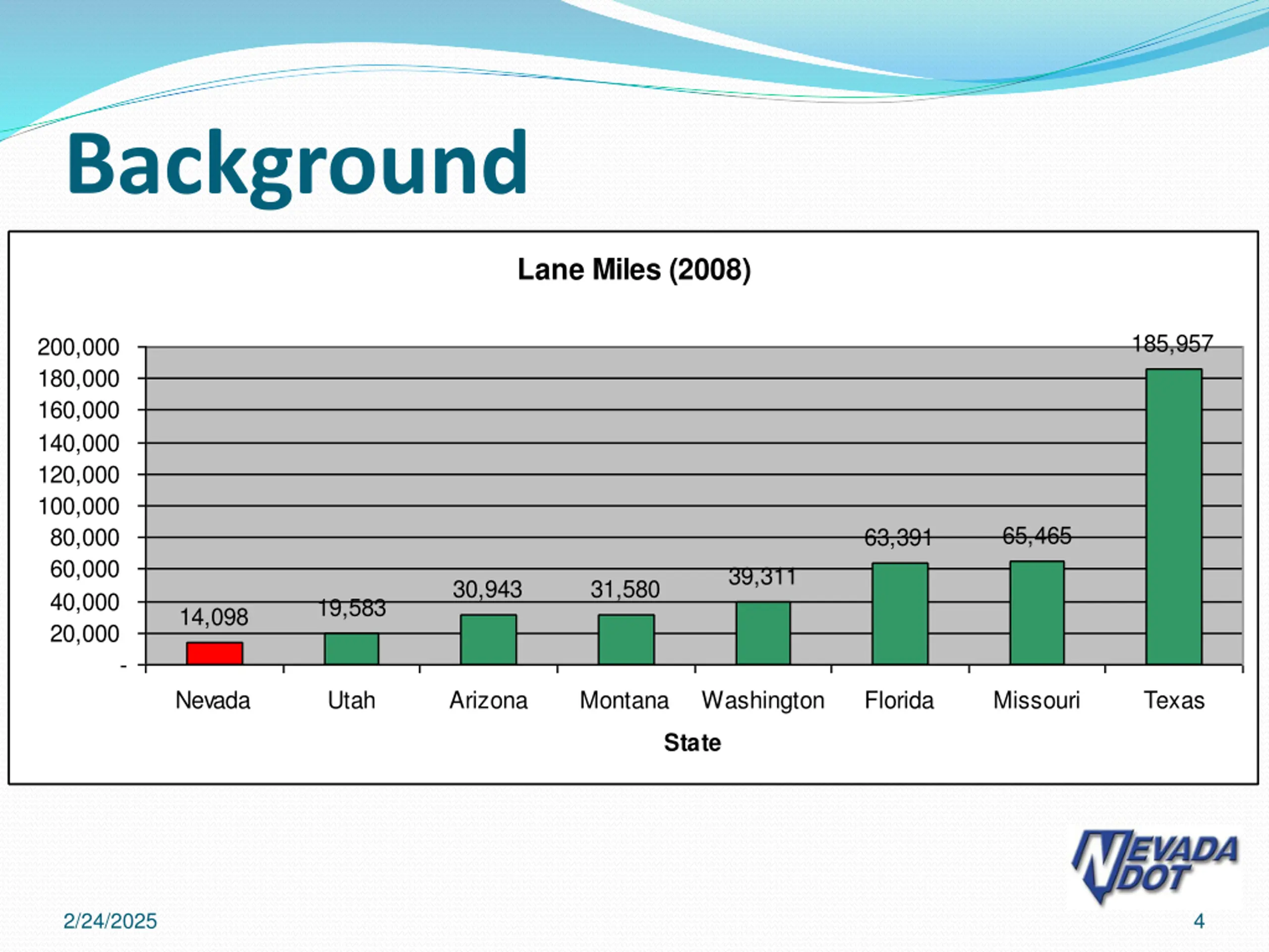 Background Lane Miles (2008) 185,957 200,000 180,000 160,000 140,000 120,000 100,000 65,465 80,000 63,391 60,000 39,311 30,943 31,580 40,000 19,583 14,098 20,000 - Nevada Utah Arizona Montana Washington Florida Missouri Texas State 2/24/2025 4