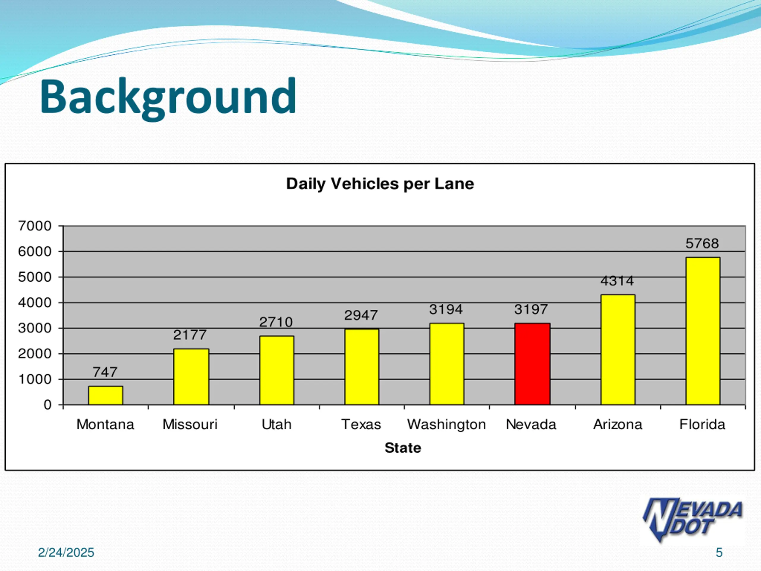 Background Daily Vehicles per Lane 7000 5768 6000 5000 4314 4000 3194 3197 2947 2710 3000 2177 2000 747 1000 0 Montana Missouri Utah Texas Washington Nevada Arizona Florida State 2/24/2025 5