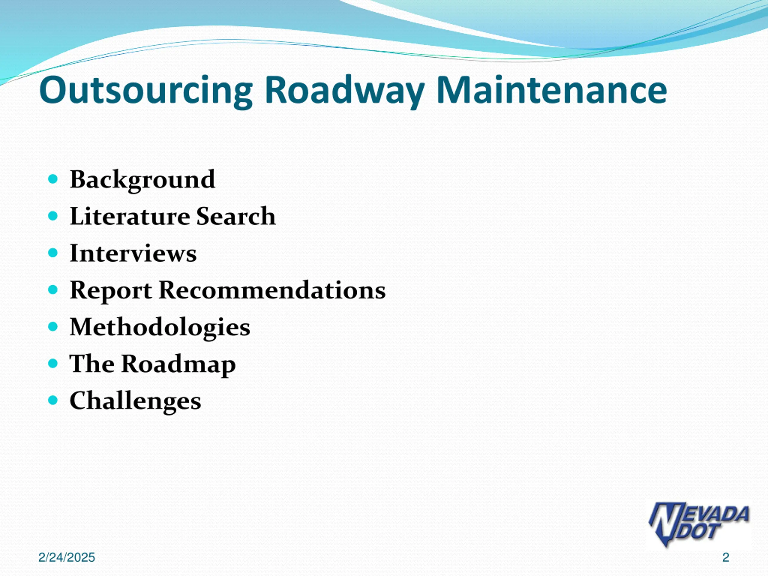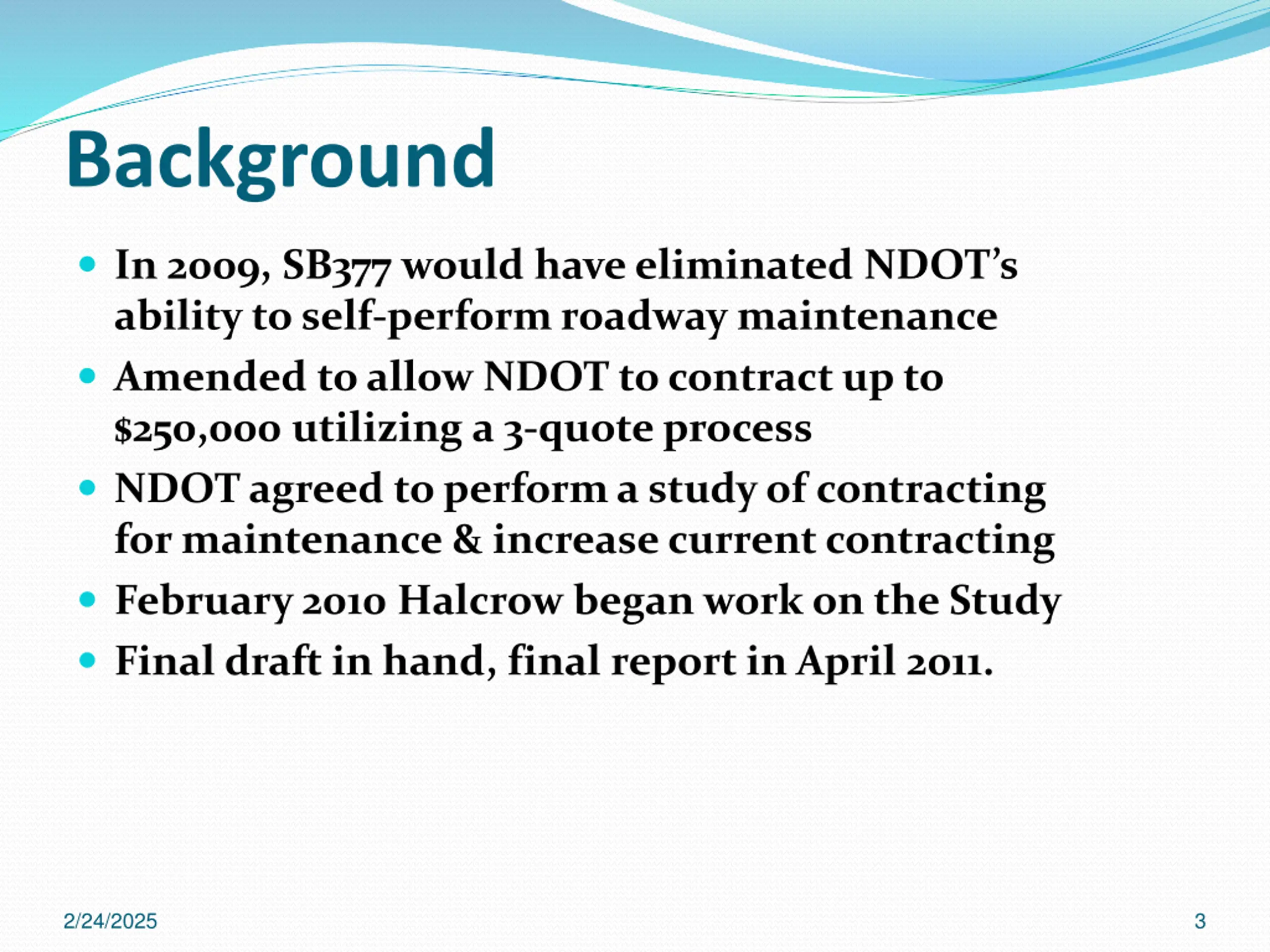 Background In 2009, SB377 would have eliminated NDOT s ability to self-perform roadway maintenance Amended to allow NDOT to contract up to $250,000 utilizing a 3-quote process NDOT agreed to perform a study of contracting for maintenance & increase current contracting February 2010 Halcrow began work on the Study Final draft in hand, final report in April 2011. 2/24/2025 3
