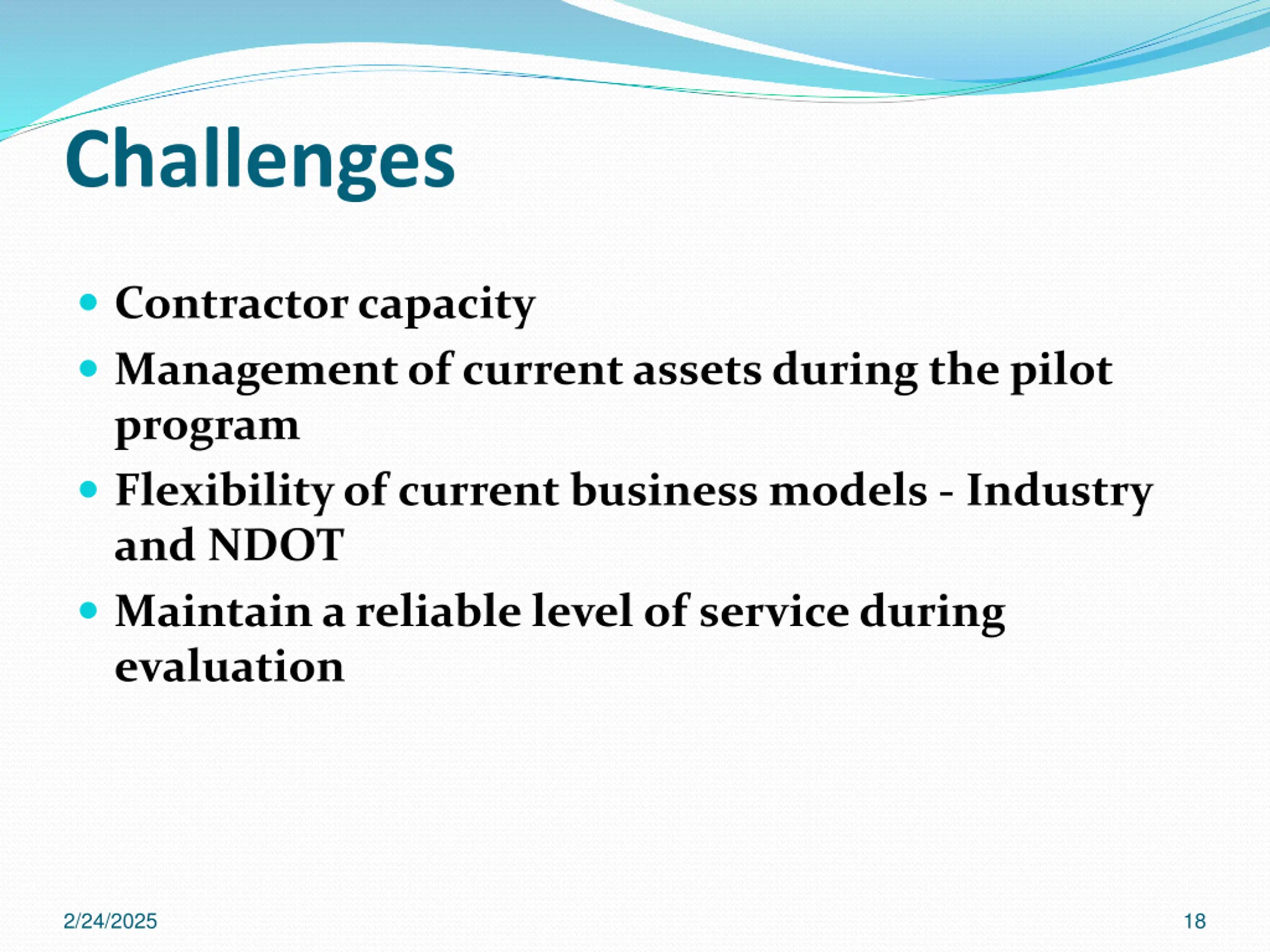 Challenges Contractor capacity Management of current assets during the pilot program Flexibility of current business models - Industry and NDOT Maintain a reliable level of service during evaluation 2/24/2025 18