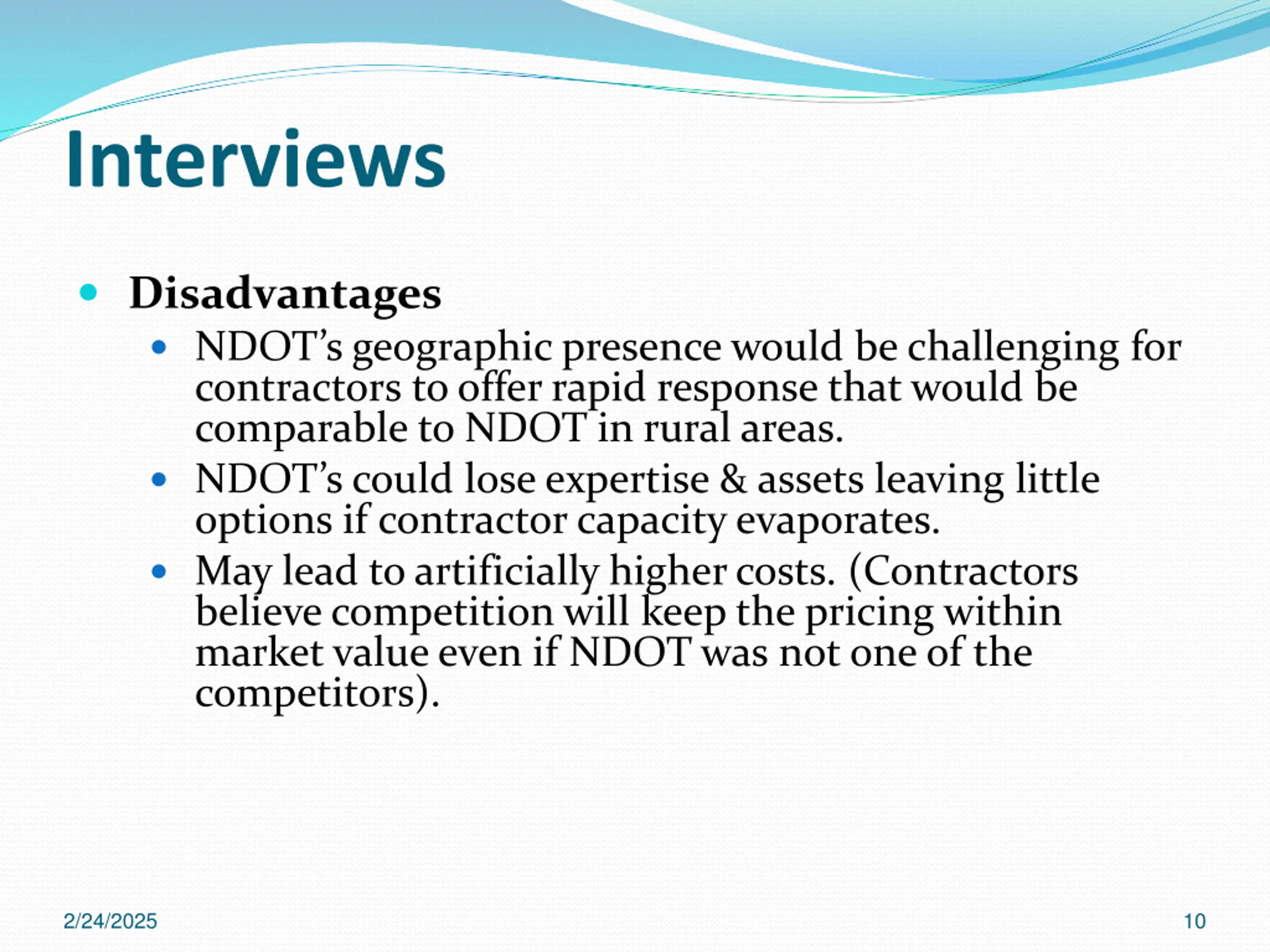 Interviews Disadvantages NDOT s geographic presence would be challenging for contractors to offer rapid response that would be comparable to NDOT in rural areas. NDOT s could lose expertise & assets leaving little options if contractor capacity evaporates. May lead to artificially higher costs. (Contractors believe competition will keep the pricing within market value even if NDOT was not one of the competitors). 2/24/2025 10