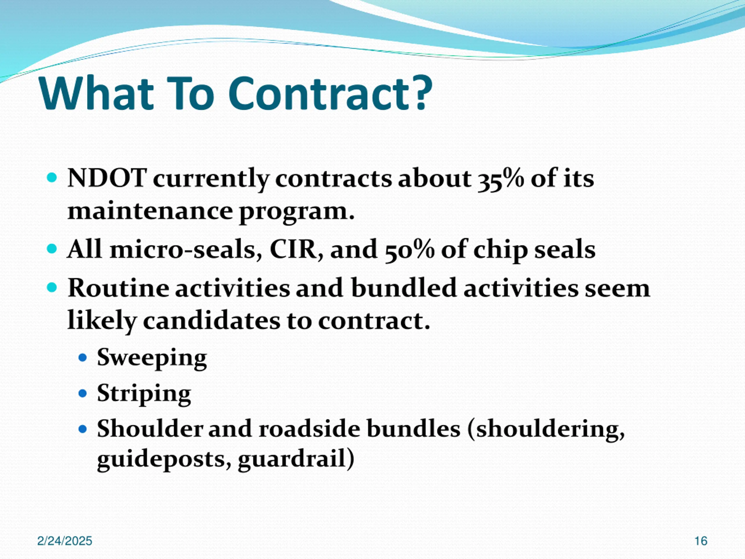 What To Contract? NDOT currently contracts about 35% of its maintenance program. All micro-seals, CIR, and 50% of chip seals Routine activities and bundled activities seem likely candidates to contract. Sweeping Striping Shoulder and roadside bundles (shouldering, guideposts, guardrail) 2/24/2025 16