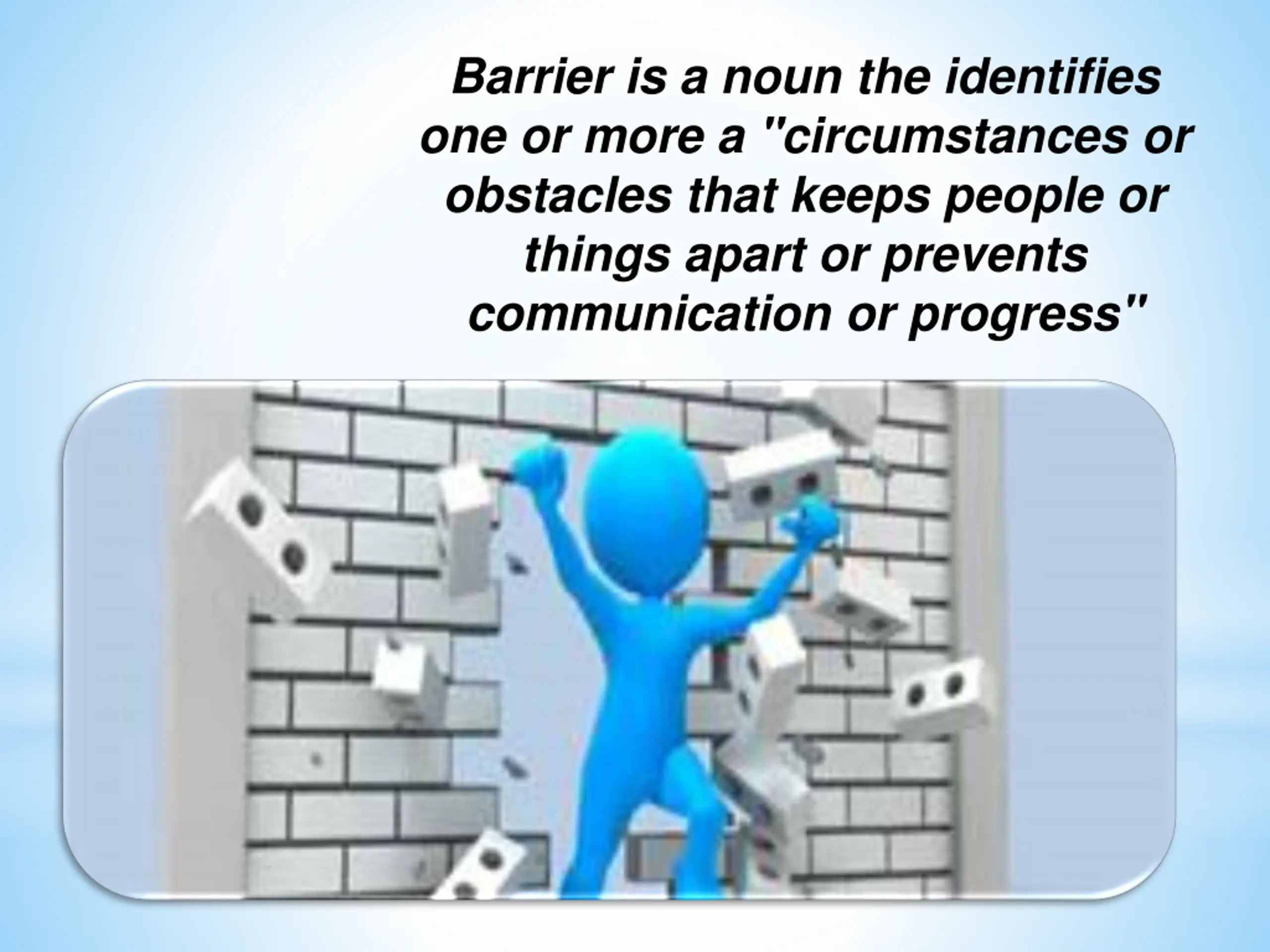 Barrier is a noun the identifies one or more a "circumstances or obstacles that keeps people or things apart or prevents communication or progress" Click to add text