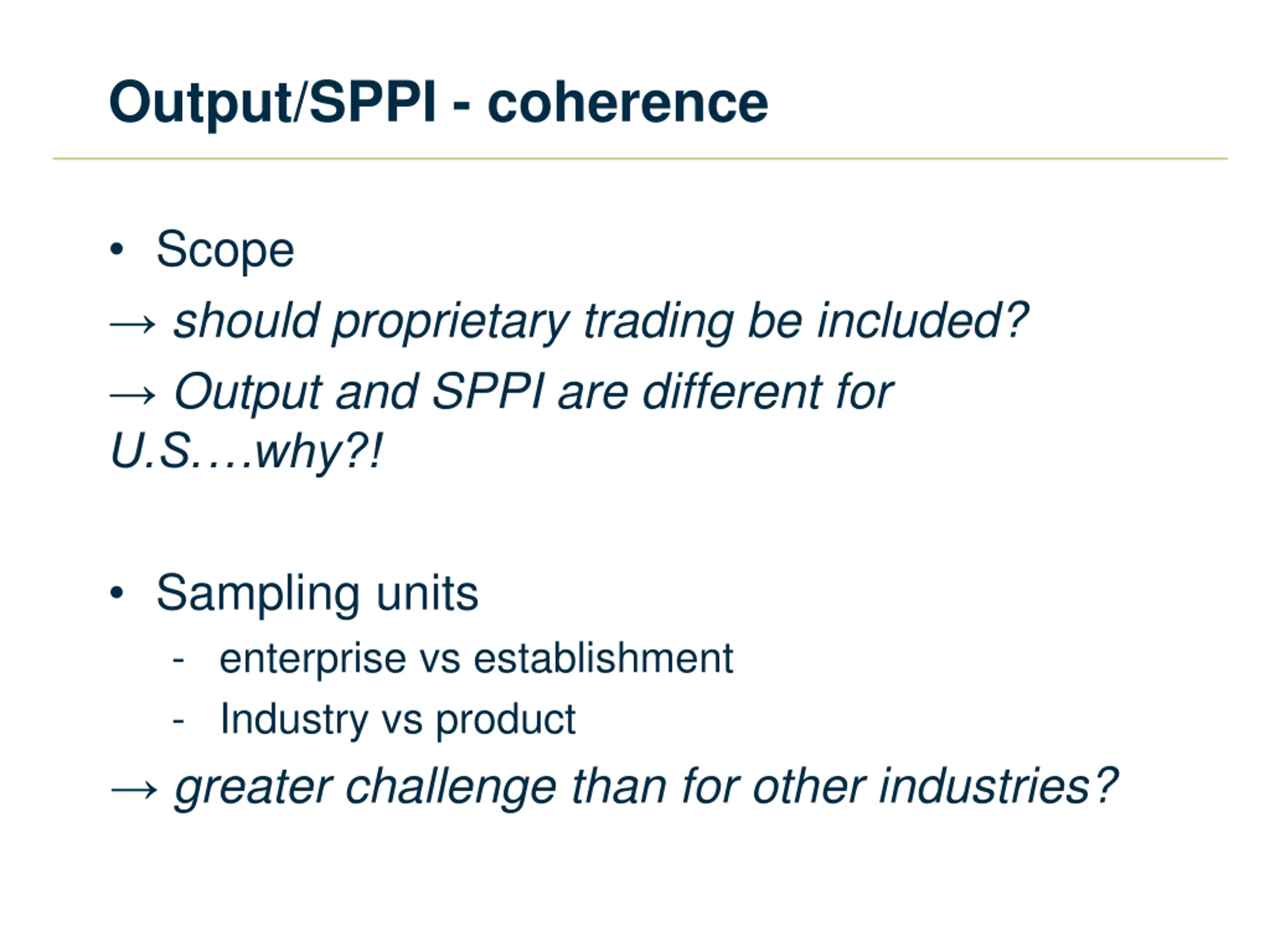 Output/SPPI - coherence Scope should proprietary trading be included? Output and SPPI are different for U.S. why?! Sampling units - enterprise vs establishment - Industry vs product greater challenge than for other industries?