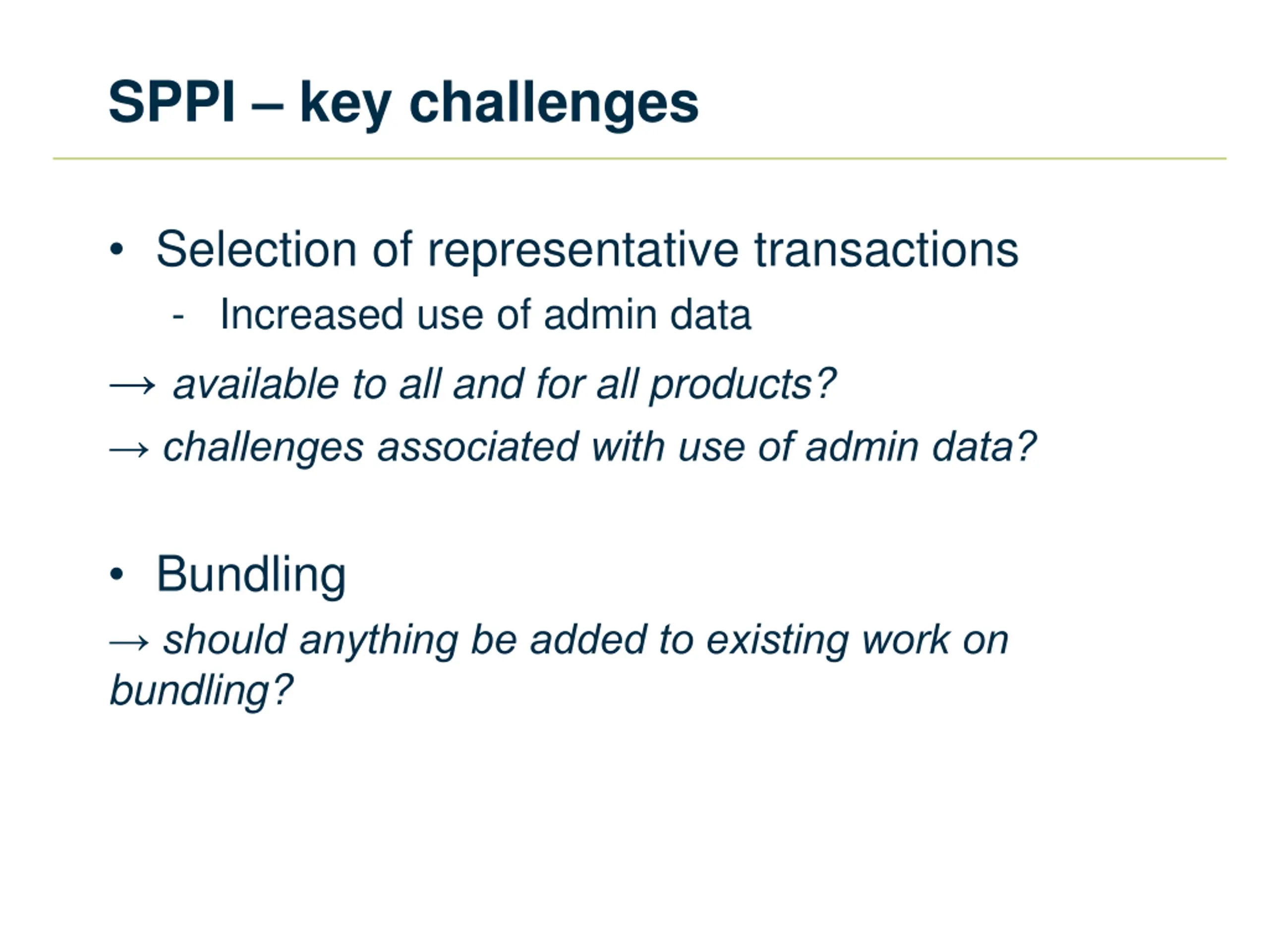 SPPI key challenges Selection of representative transactions - Increased use of admin data available to all and for all products? challenges associated with use of admin data? Bundling should anything be added to existing work on bundling?