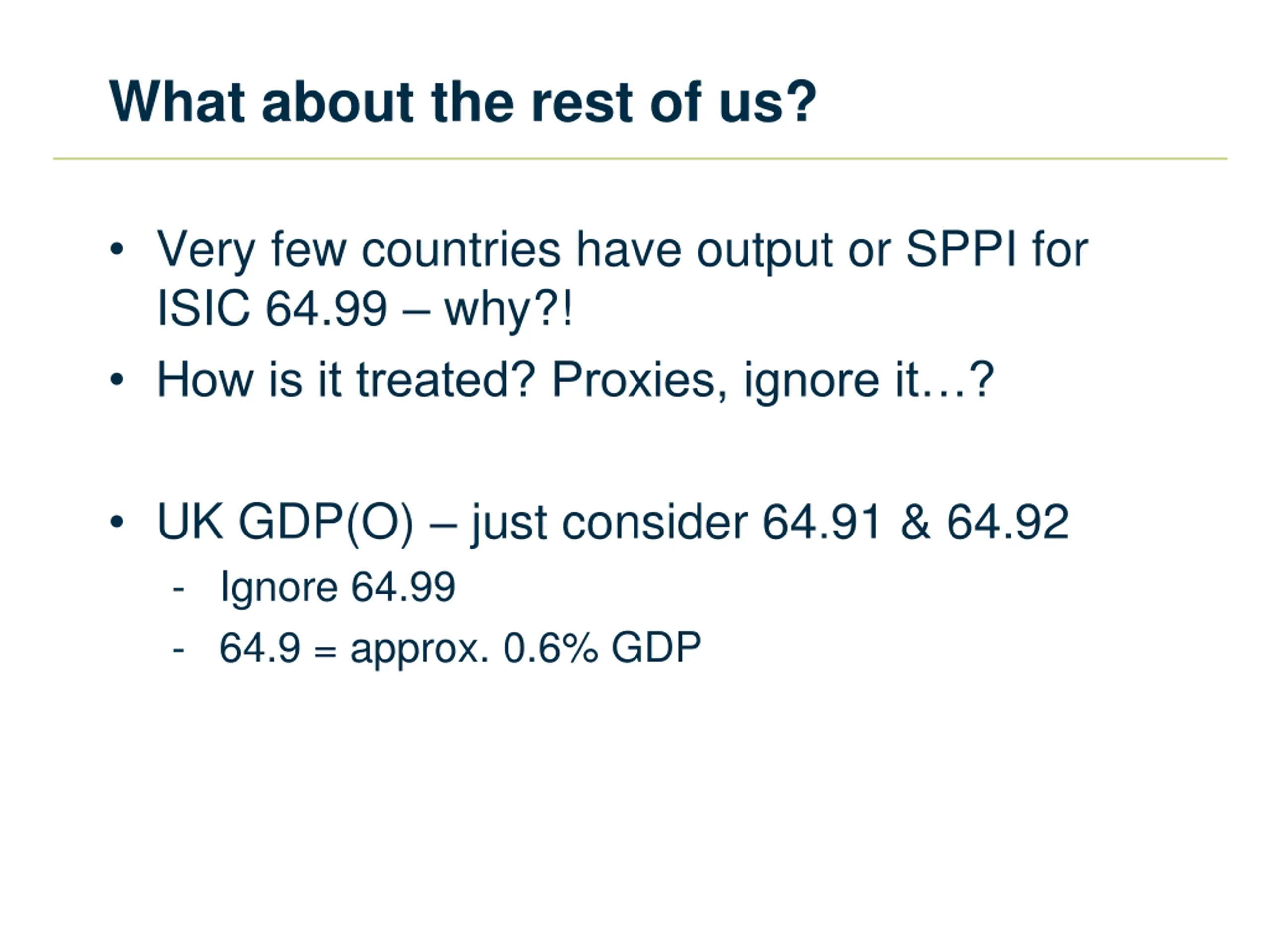 What about the rest of us? Very few countries have output or SPPI for ISIC 64.99 why?! How is it treated? Proxies, ignore it ? UK GDP(O) just consider 64.91 & 64.92 - Ignore 64.99 - 64.9 = approx. 0.6% GDP
