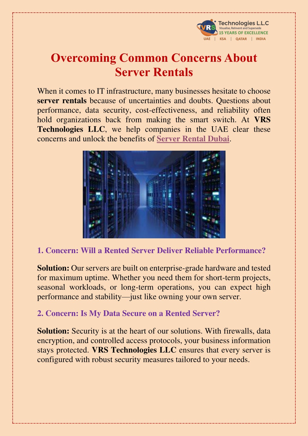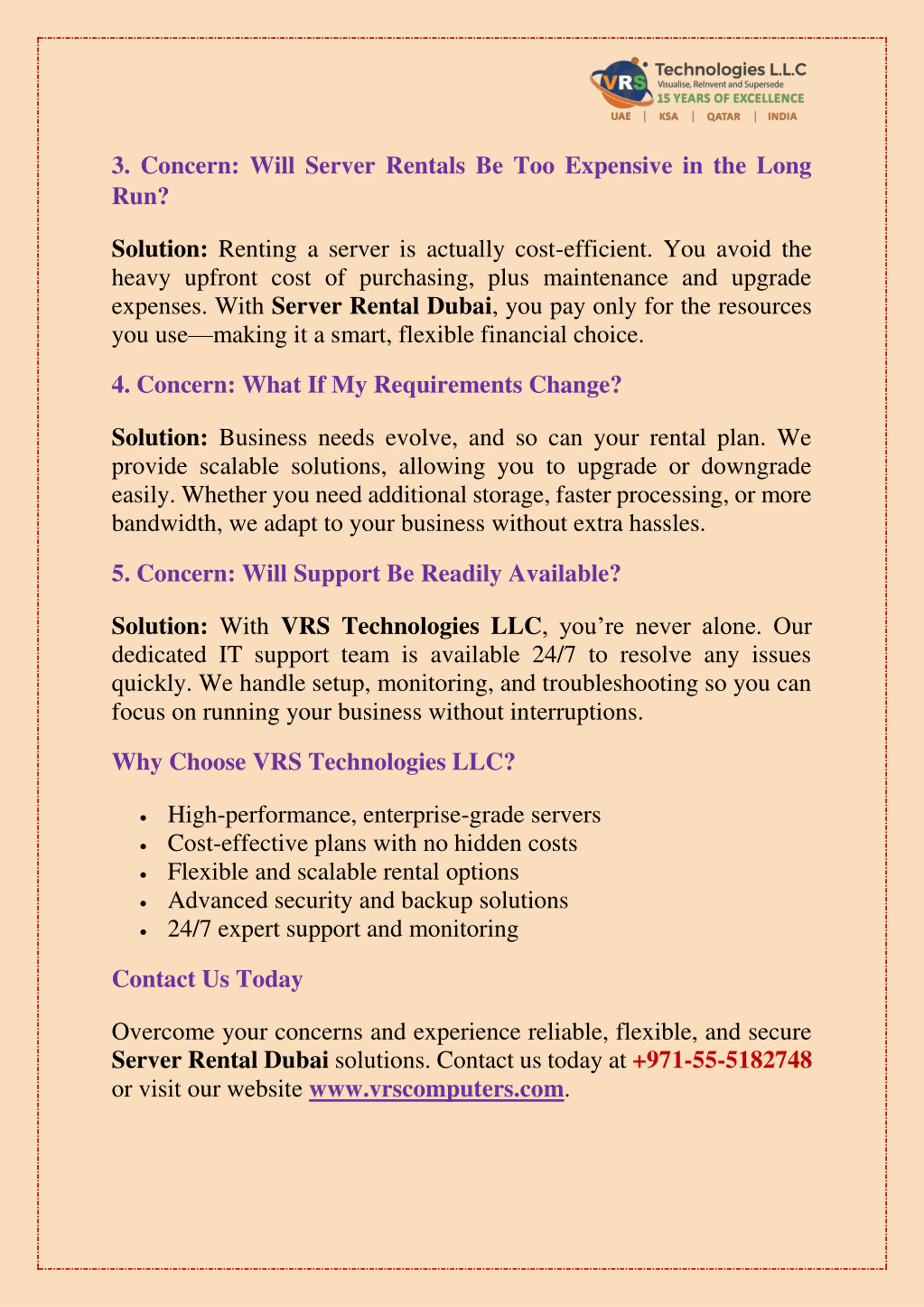 3. Concern: Will Server Rentals Be Too Expensive in the Long Run? Solution: Renting a server is actually cost-efficient. You avoid the heavy upfront cost of purchasing, plus maintenance and upgrade expenses. With Server Rental Dubai, you pay only for the resources you use making it a smart, flexible financial choice. 4. Concern: What If My Requirements Change? Solution: Business needs evolve, and so can your rental plan. We provide scalable solutions, allowing you to upgrade or downgrade easily. Whether you need additional storage, faster processing, or more bandwidth, we adapt to your business without extra hassles. 5. Concern: Will Support Be Readily Available? Solution: With VRS Technologies LLC, you re never alone. Our dedicated IT support team is available 24/7 to resolve any issues quickly. We handle setup, monitoring, and troubleshooting so you can focus on running your business without interruptions. Why Choose VRS Technologies LLC? High-performance, enterprise-grade servers Cost-effective plans with no hidden costs Flexible and scalable rental options Advanced security and backup solutions 24/7 expert support and monitoring Contact Us Today Overcome your concerns and experience reliable, flexible, and secure Server Rental Dubai solutions. Contact us today at +971-55-5182748 or visit our website www.vrscomputers.com.
